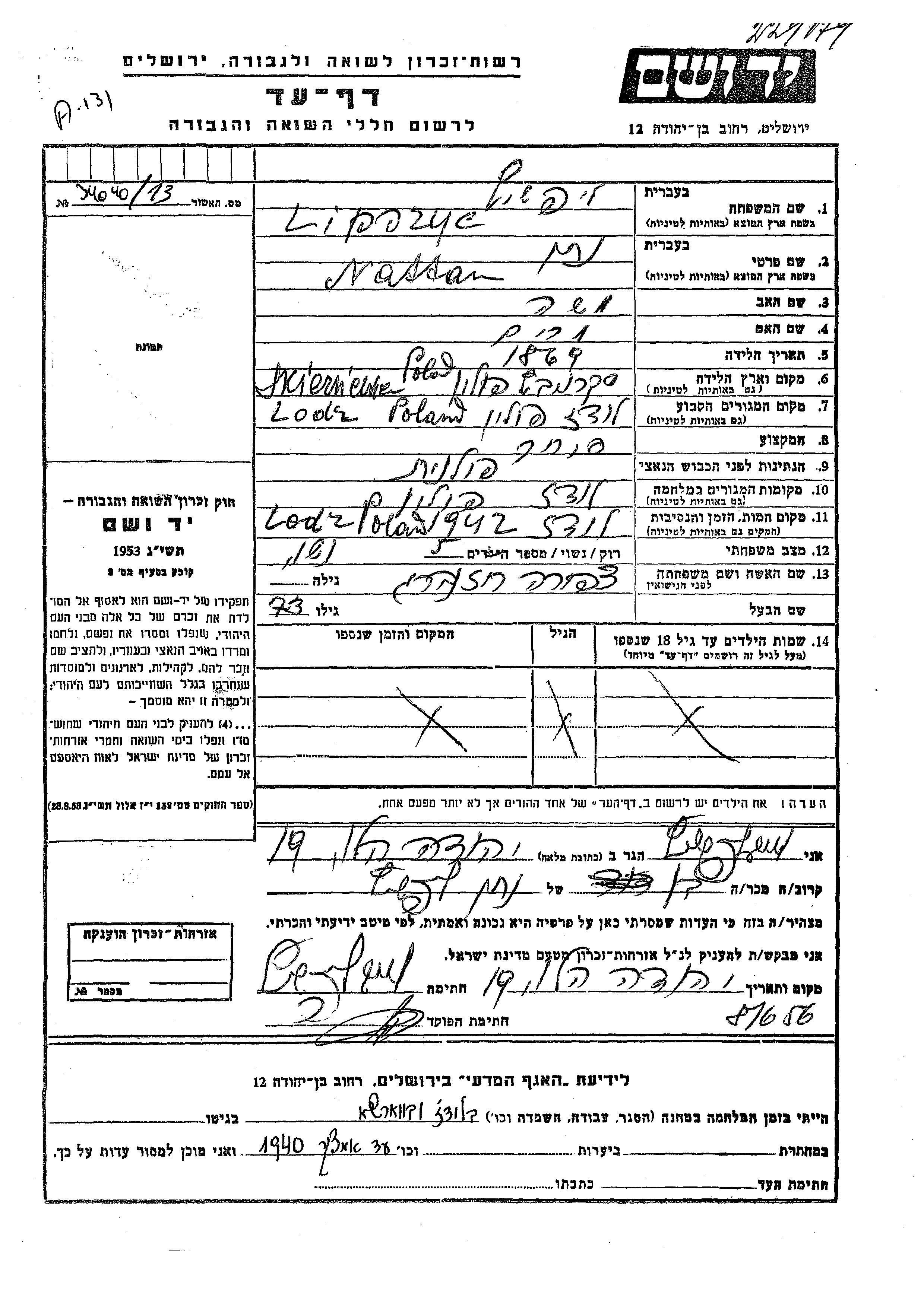Наттан Липшиц, место рождения: Скерневице, Польша. Отец: Моше, mать:Мирьям. Торговец / торговка. Женат / замужем. Место жительства до войны: Лодзь, Польша. Место во время войны: Лодзь, Польша.