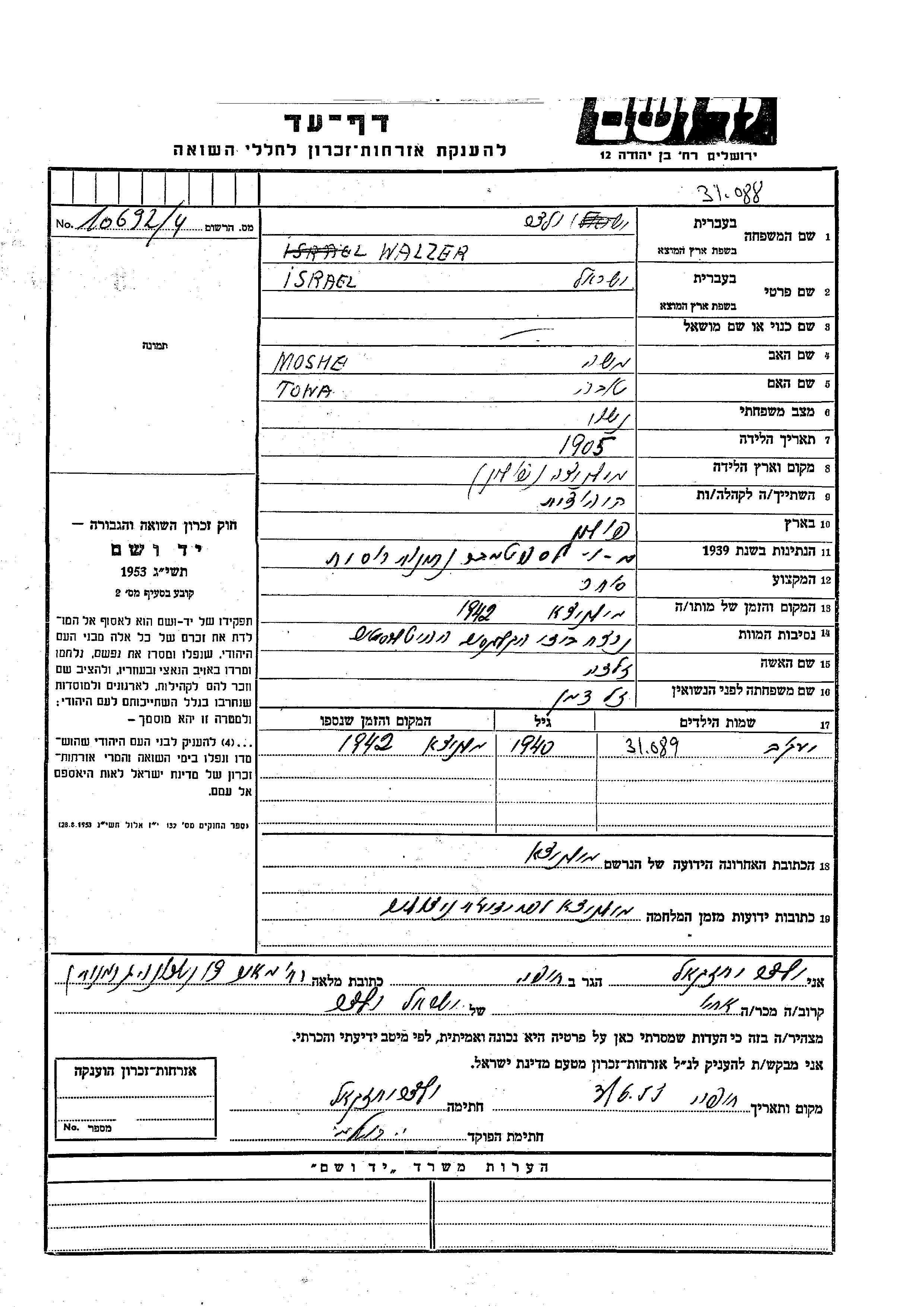 Яков Вальцер. Отец: Исраэль, mать:Зельда, девичья фамилия Зальдман. Ребенок. Место во время войны: Мельница, Польша.