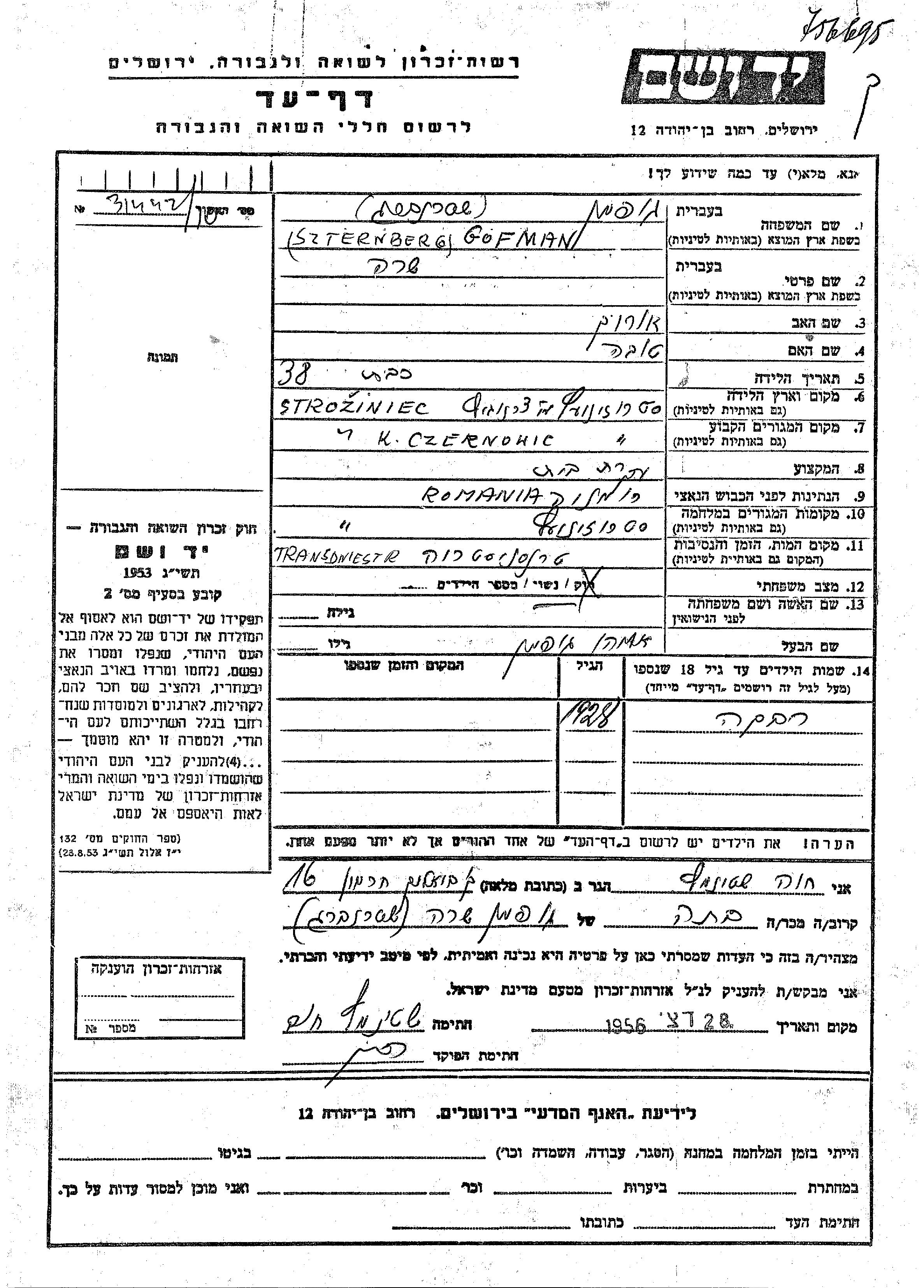 Гофман Ривка Черновиц, Румыния Лист свидетельских показаний
