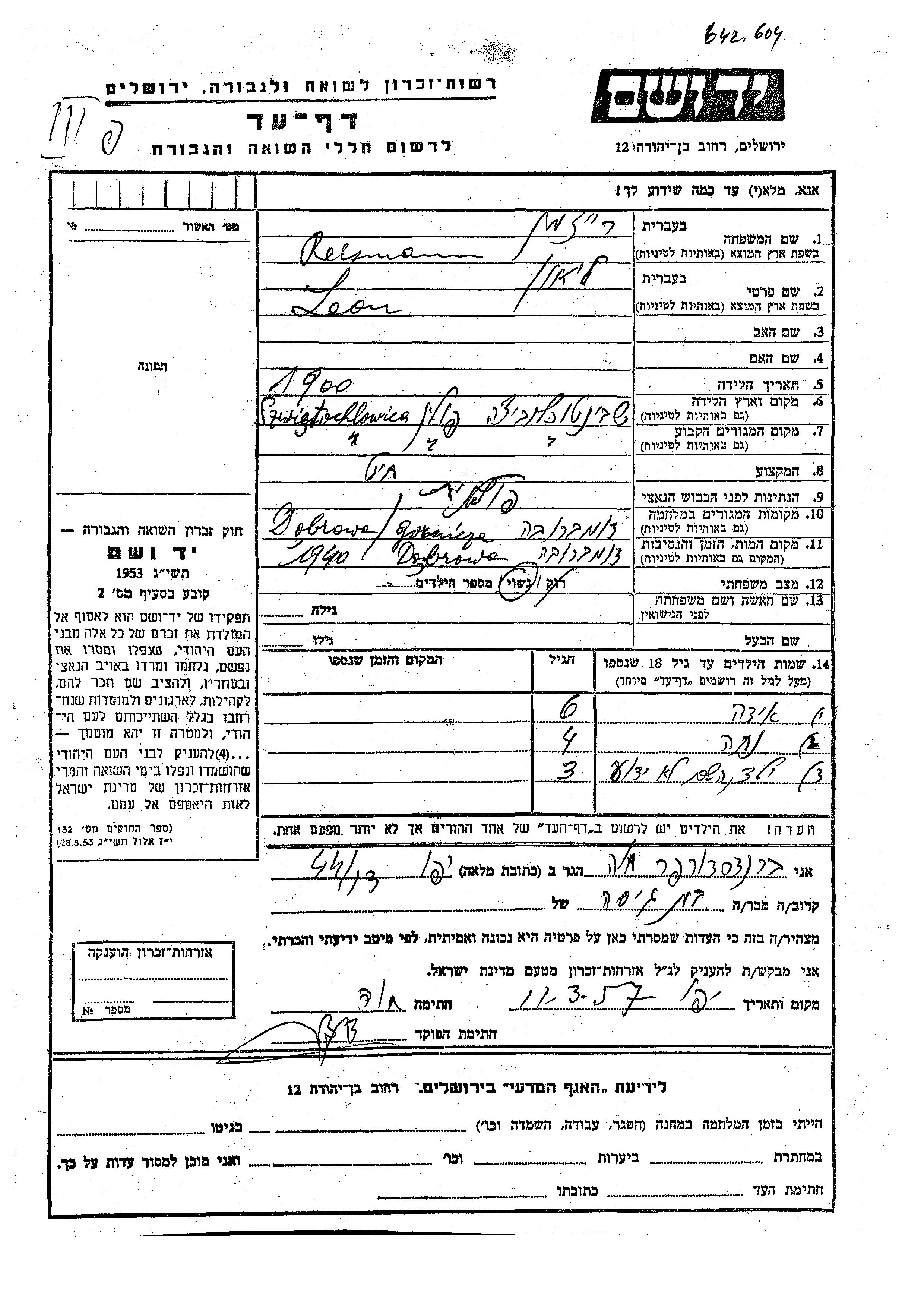 Яд Вашем - Листы свидетельских показаний Мемориального фонда