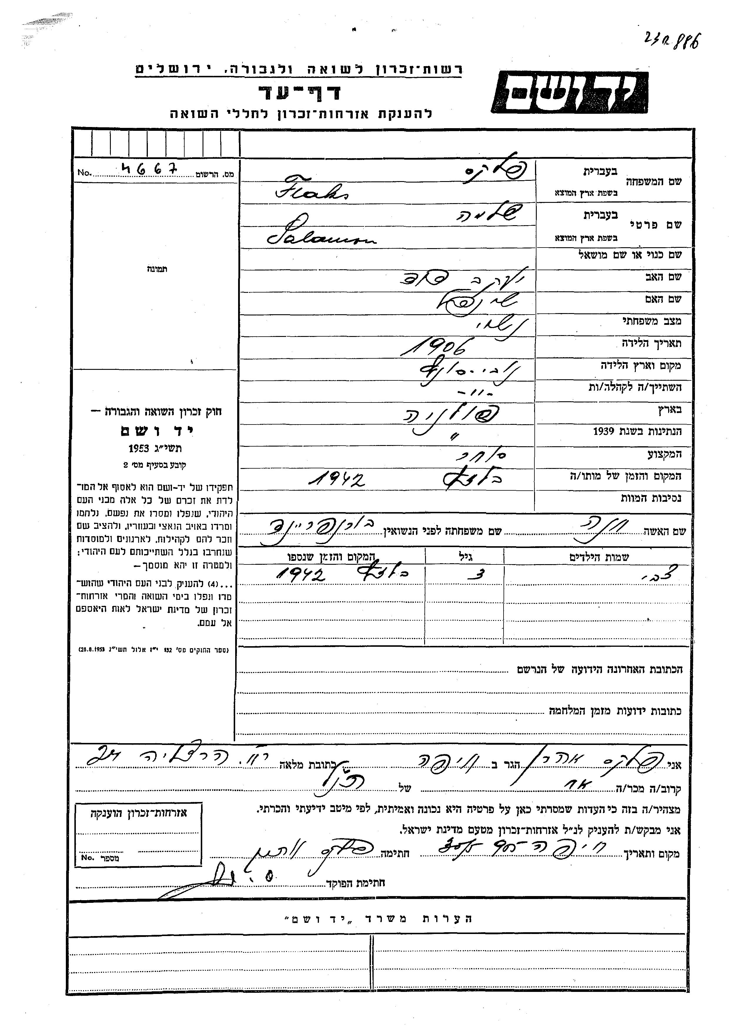 Яд Вашем - Листы свидетельских показаний Мемориального фонда