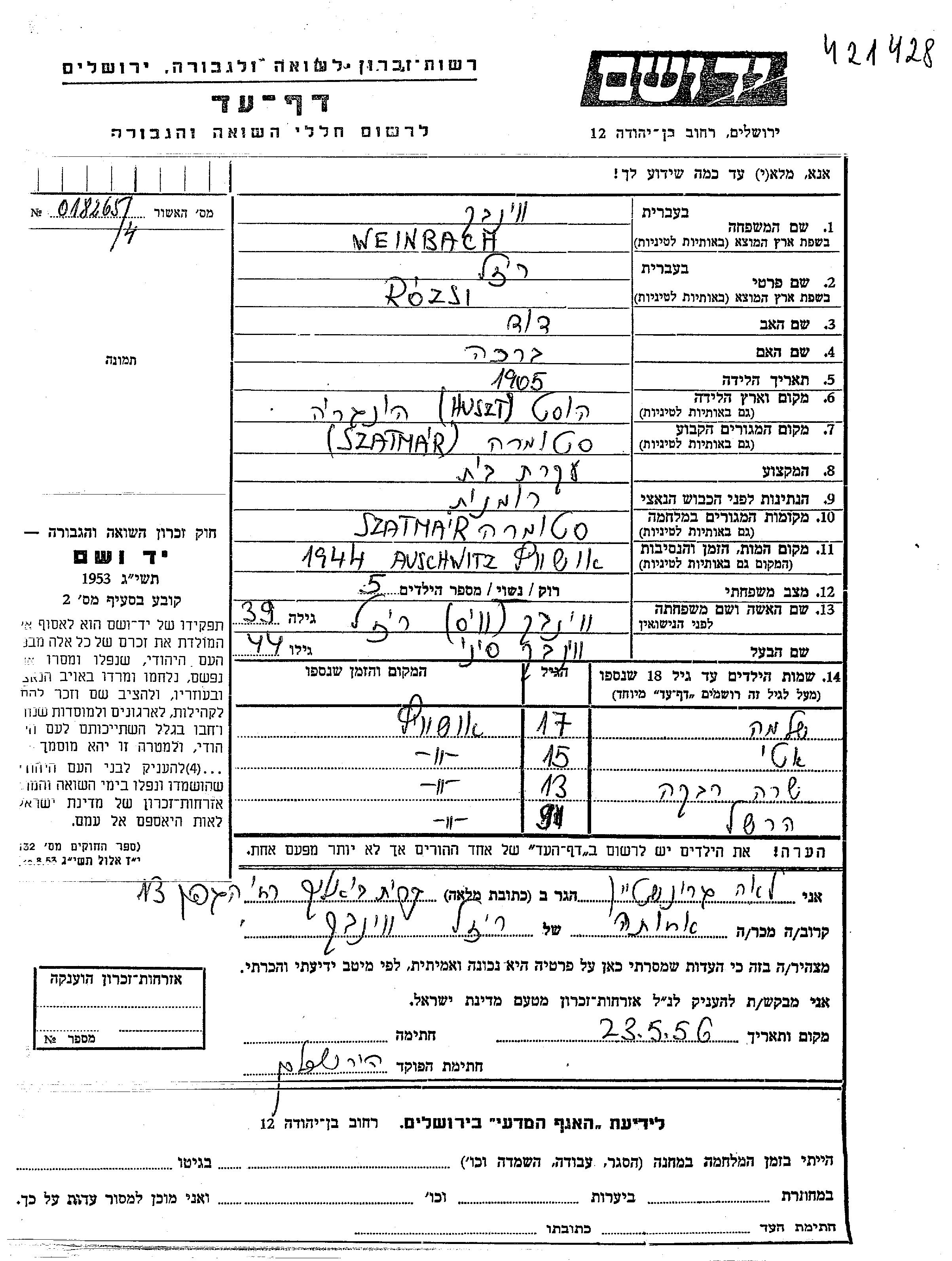 Вейнбах Сара Ривка Сатмарнемети, Румыния Лист свидетельских показаний