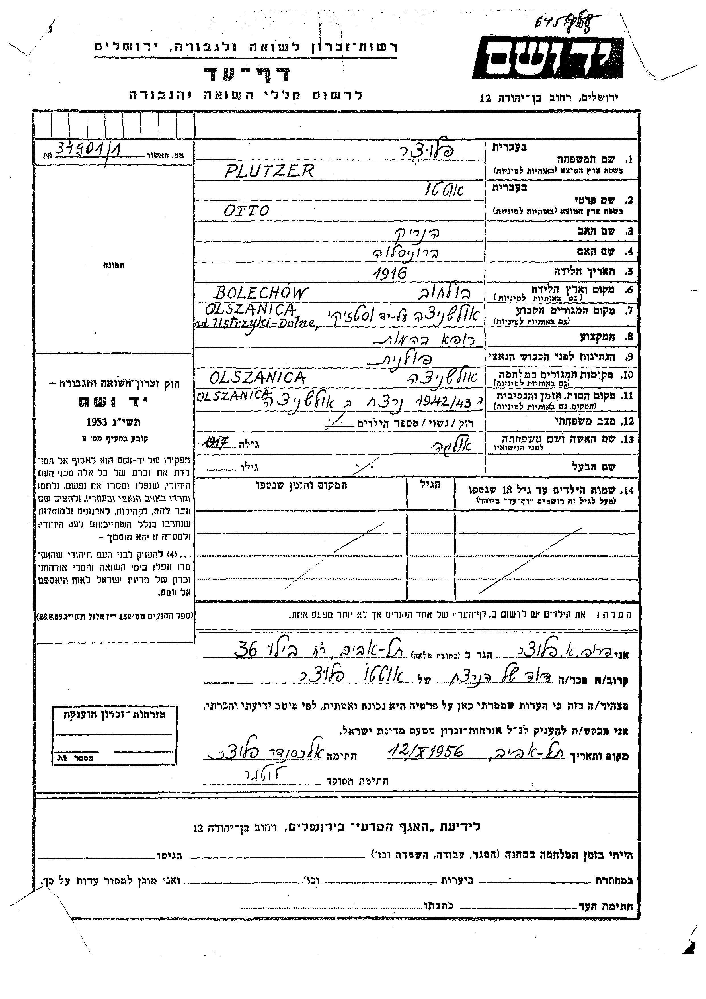 Отто Плуцер, место рождения: Болехов, Польша. Отец: Хенрик, mать:Бронислава. Ветеринар. Женат / замужем. Место жительства до войны: Ольшаница, Польша. Место во время войны: Ольшаница, Польша.