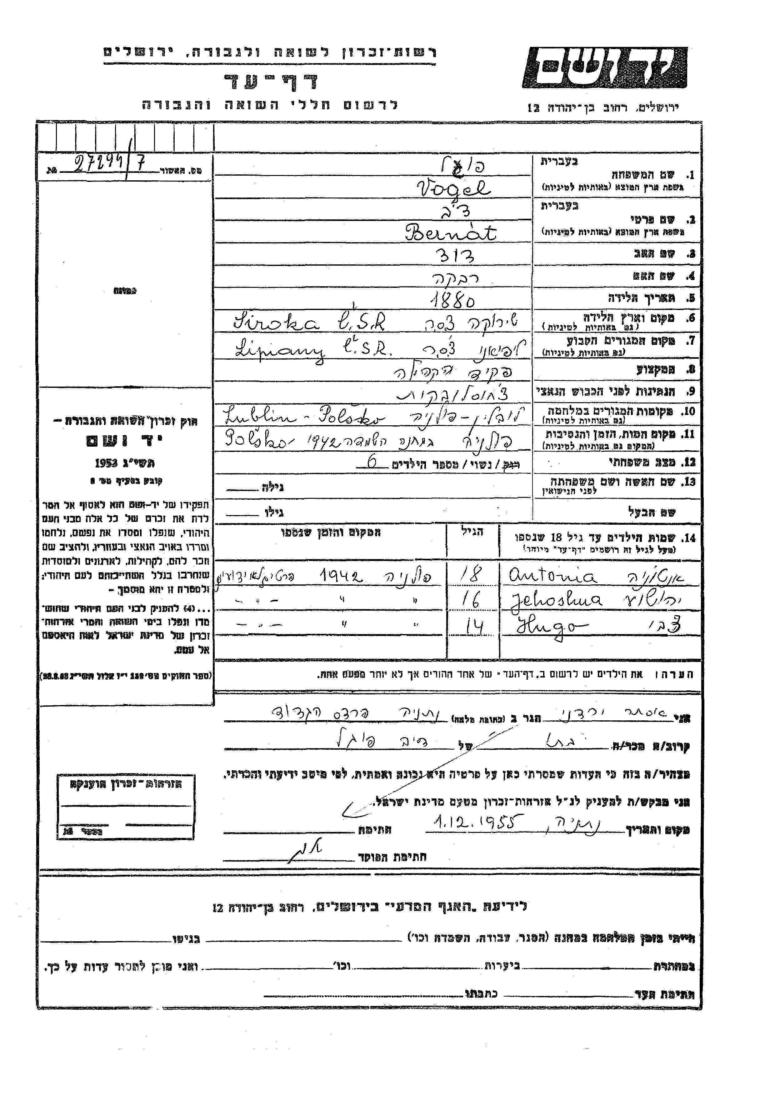 Бернат Дов Фогель, место рождения: Широка, Чехословакия. Отец: Давид, mать:Ривка. Клерк. Женат / замужем. Место жительства до войны: Липьяны, Чехословакия. Место во время войны: Люблин, Польша.