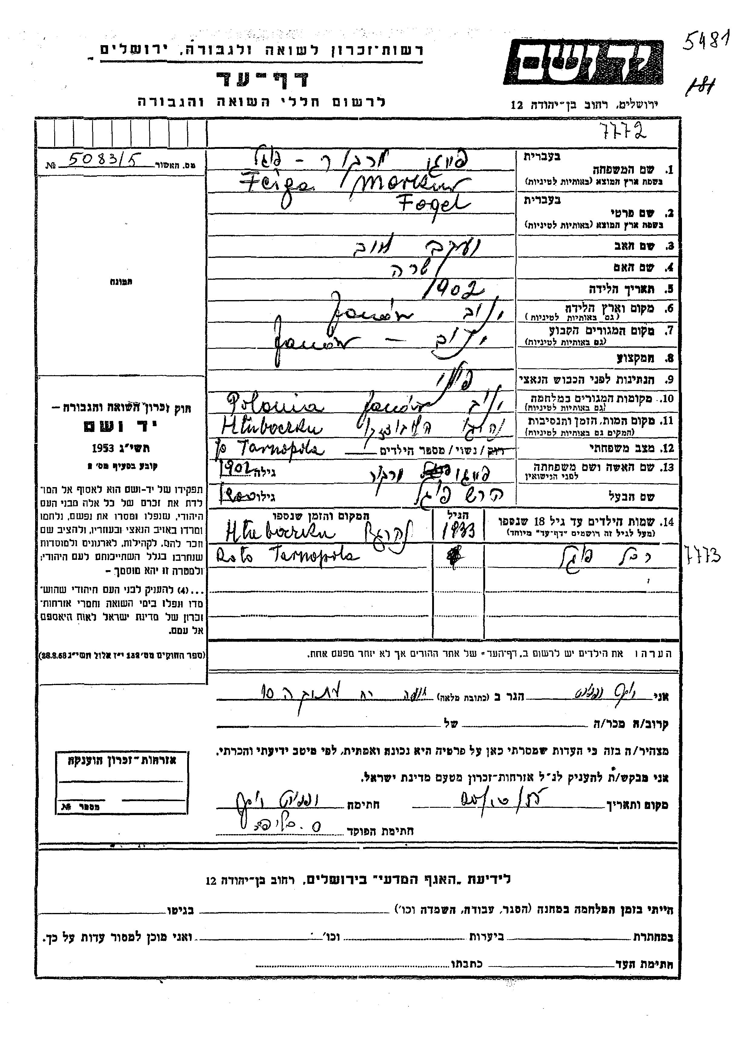 Фогель Фейги 1902 Янув, Польша Лист свидетельских показаний