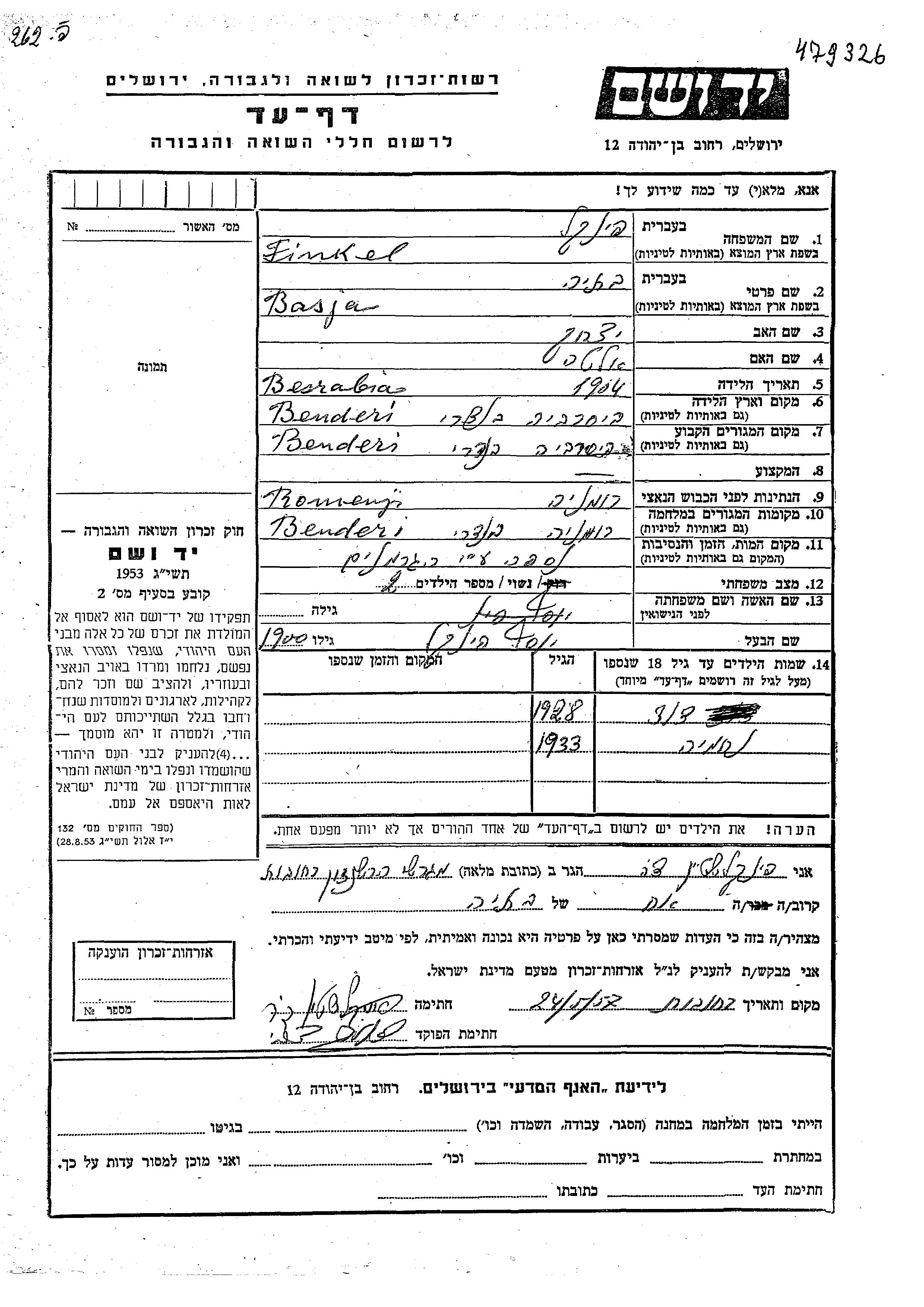 Бася Финкель, место рождения: Бендеры, Румыния. Отец: Ицхак, mать:Алте. Женат / замужем. Место жительства до войны: Бендеры, Румыния. Место во время войны: Бендер, Румыния.