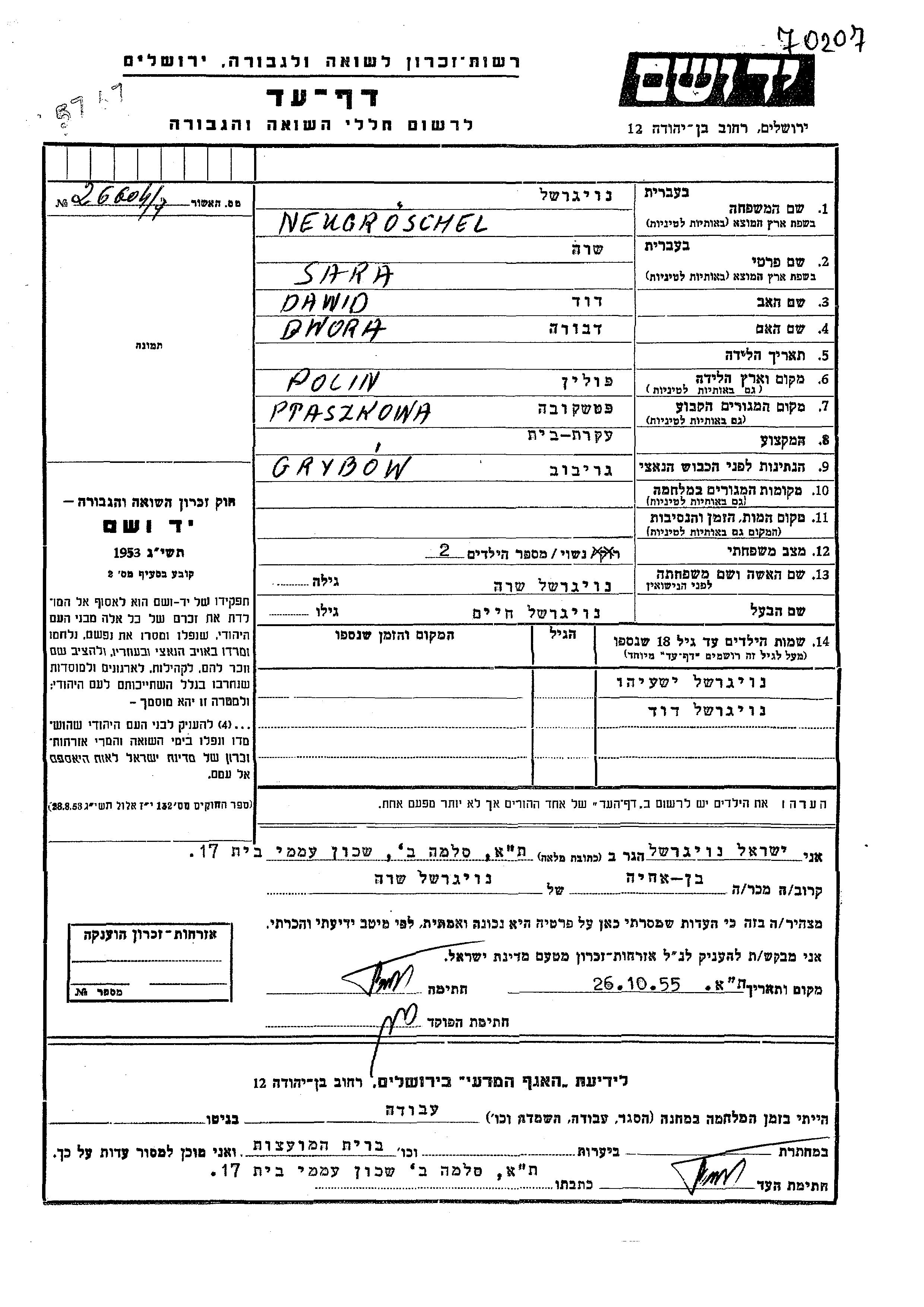 Сара Нойгрошель, девичья фамилия Нойгрешель, место рождения: Польша. Отец: Давид, mать:Двора. Домохозяйка. Женат / замужем. Место жительства до войны: Пташкова, Польша. Место во время войны: Грыбув, Польша.