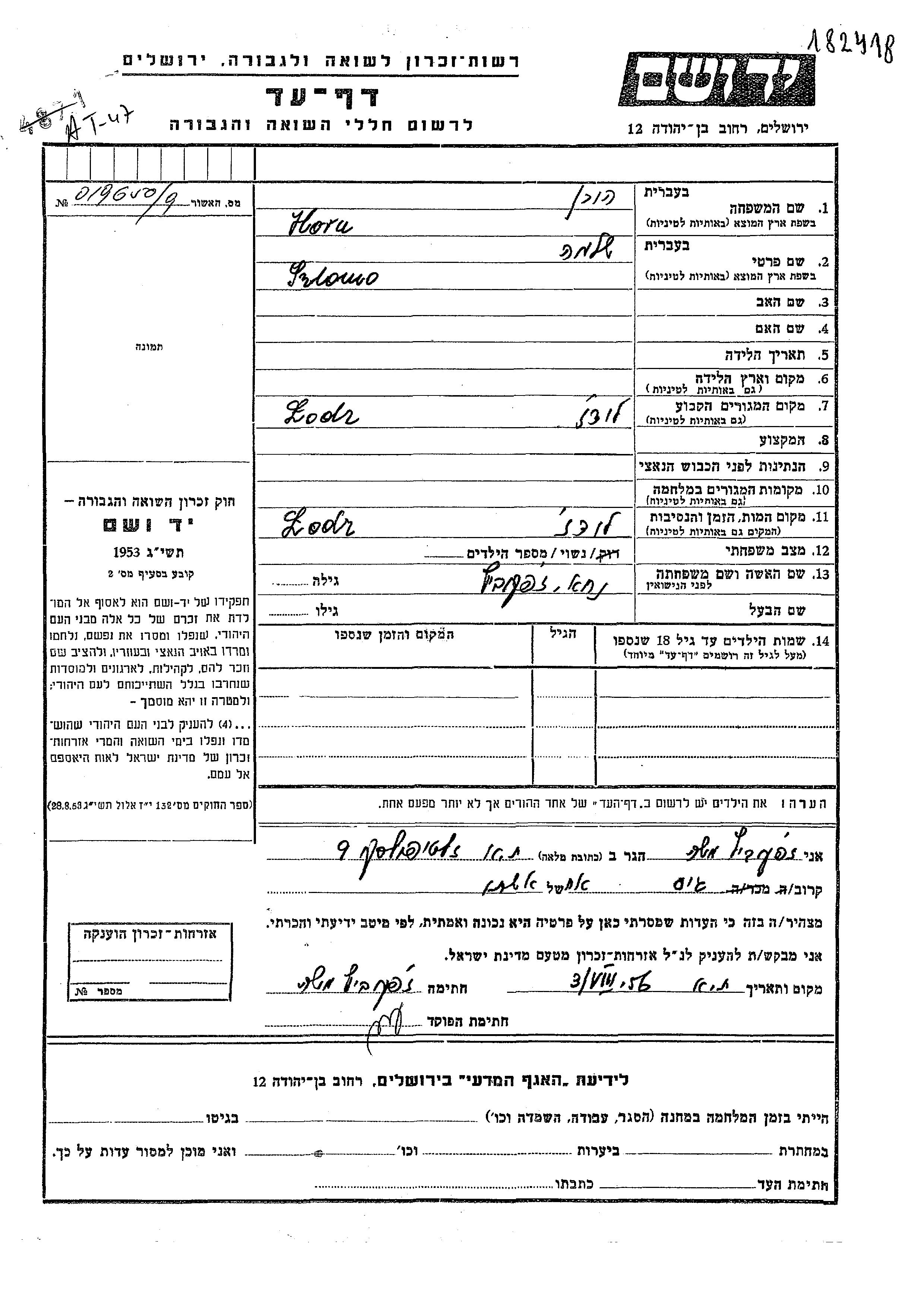 Шломо Хорн. Женат / замужем. Место жительства до войны: Лодзь, Польша.