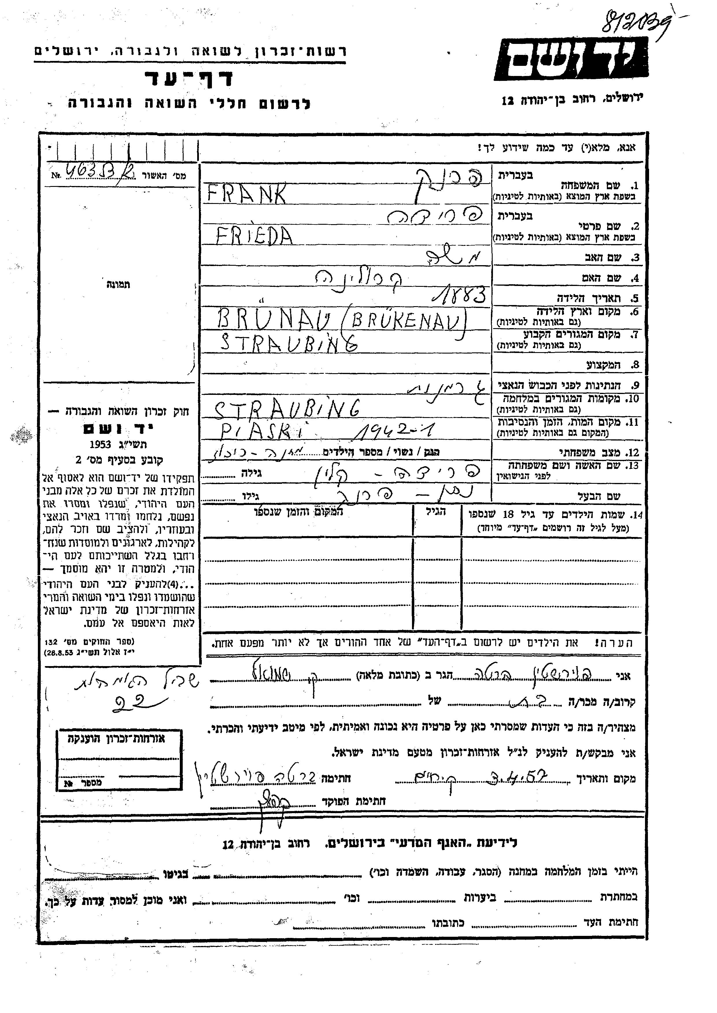 Фрида Франк, девичья фамилия Калин, место рождения: Брунау, Германия. Отец: Моше, mать:Каролина. Женат / замужем. Место жительства до войны: Штраубинг, Германия. Место во время войны: Штраубинг, Германия.