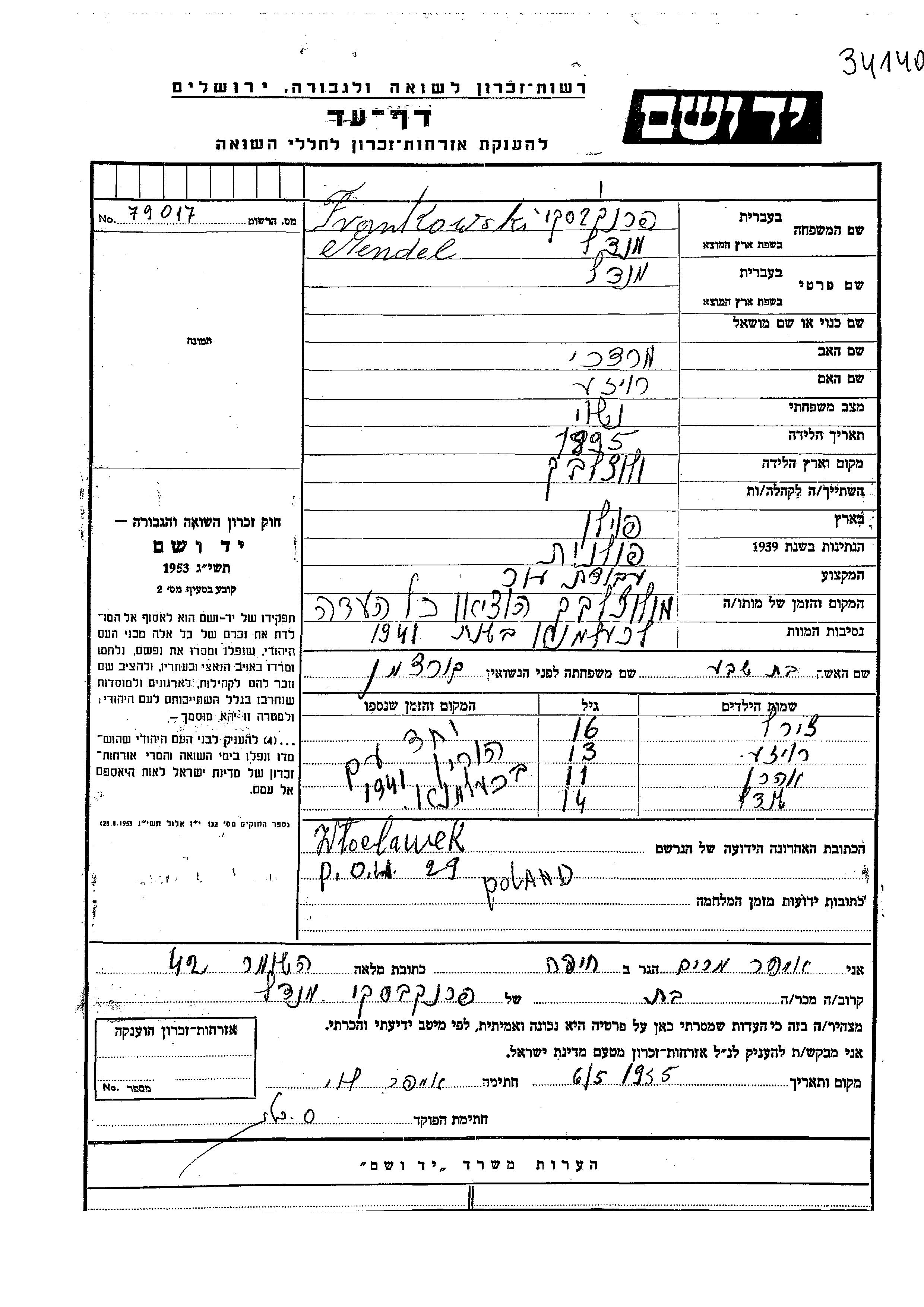 Мендель Франковски, место рождения: Влоцлавек, Польша. Отец: Мордехай, mать:Ройзе. Женат / замужем. Место жительства до войны: Влоцлавек, Польша. Место во время войны: Польша.
