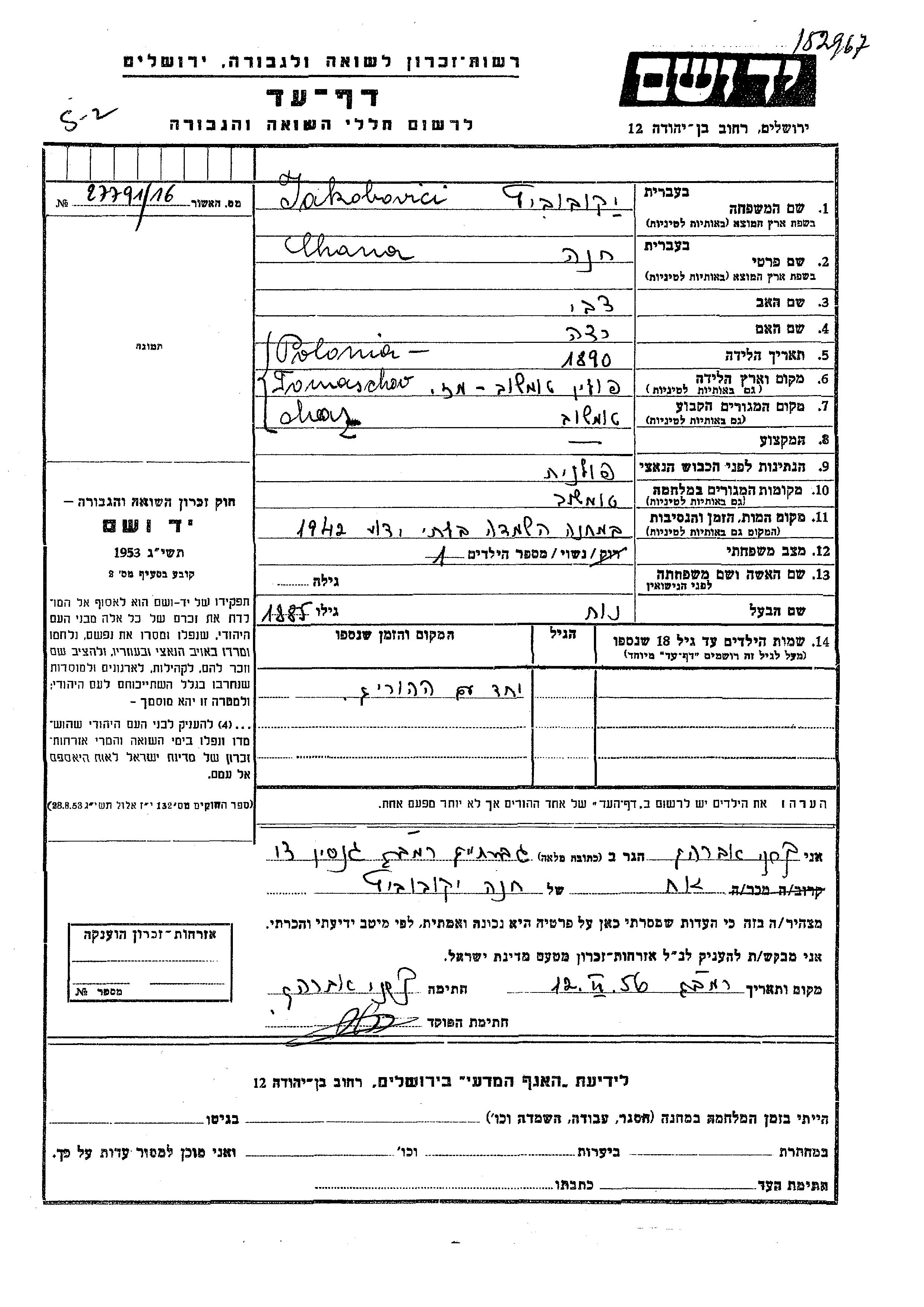 Хана Якобович, место рождения: Томашув-Мазовецки, Польша. Отец: Цви, mать:Рада. Женат / замужем. Место жительства до войны: Томашув-Мазовецки, Польша. Место во время войны: Томашув-Мазовецки, Польша.