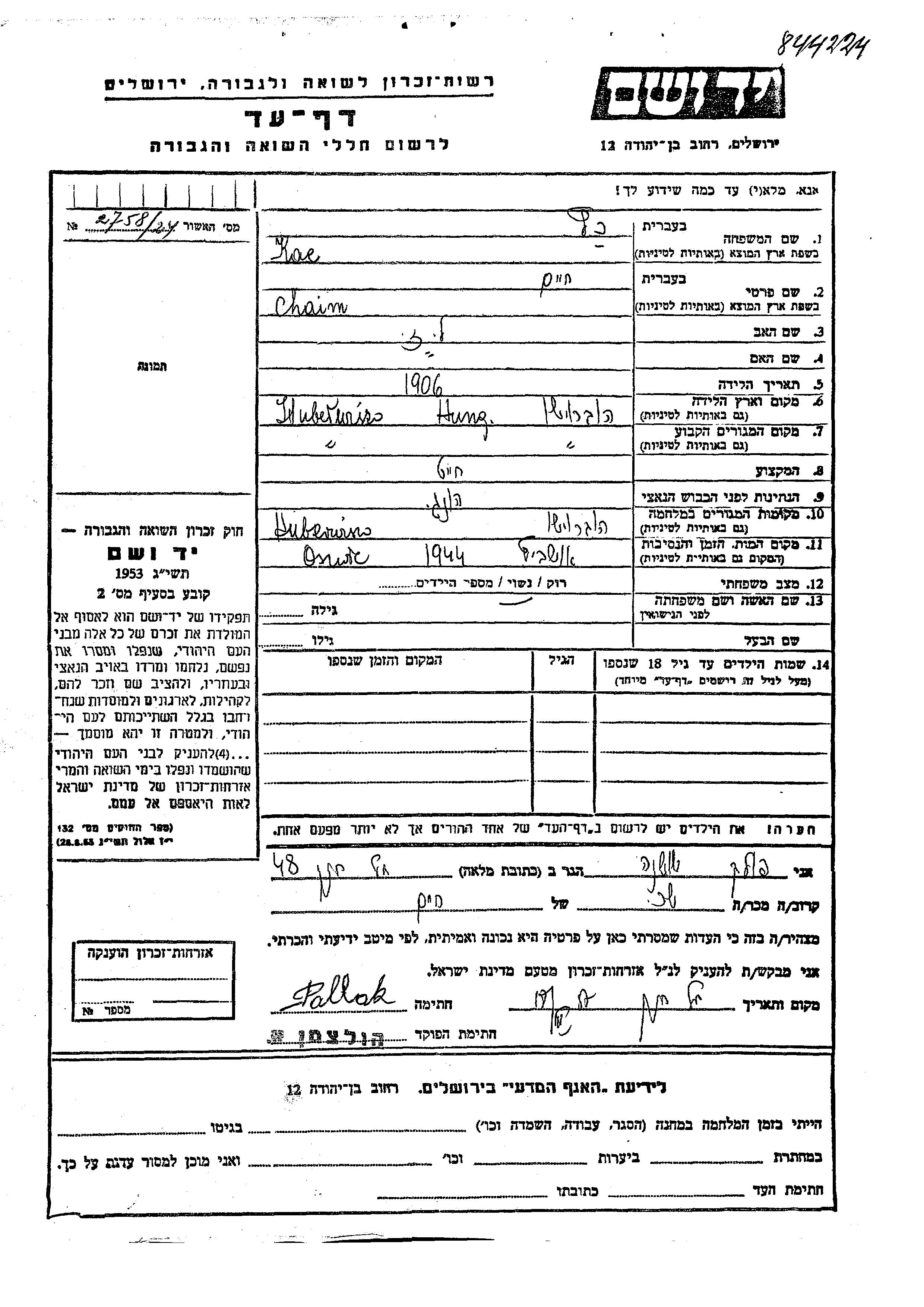Кац Хаим 1906 Хобервисо, Румыния Лист свидетельских показаний