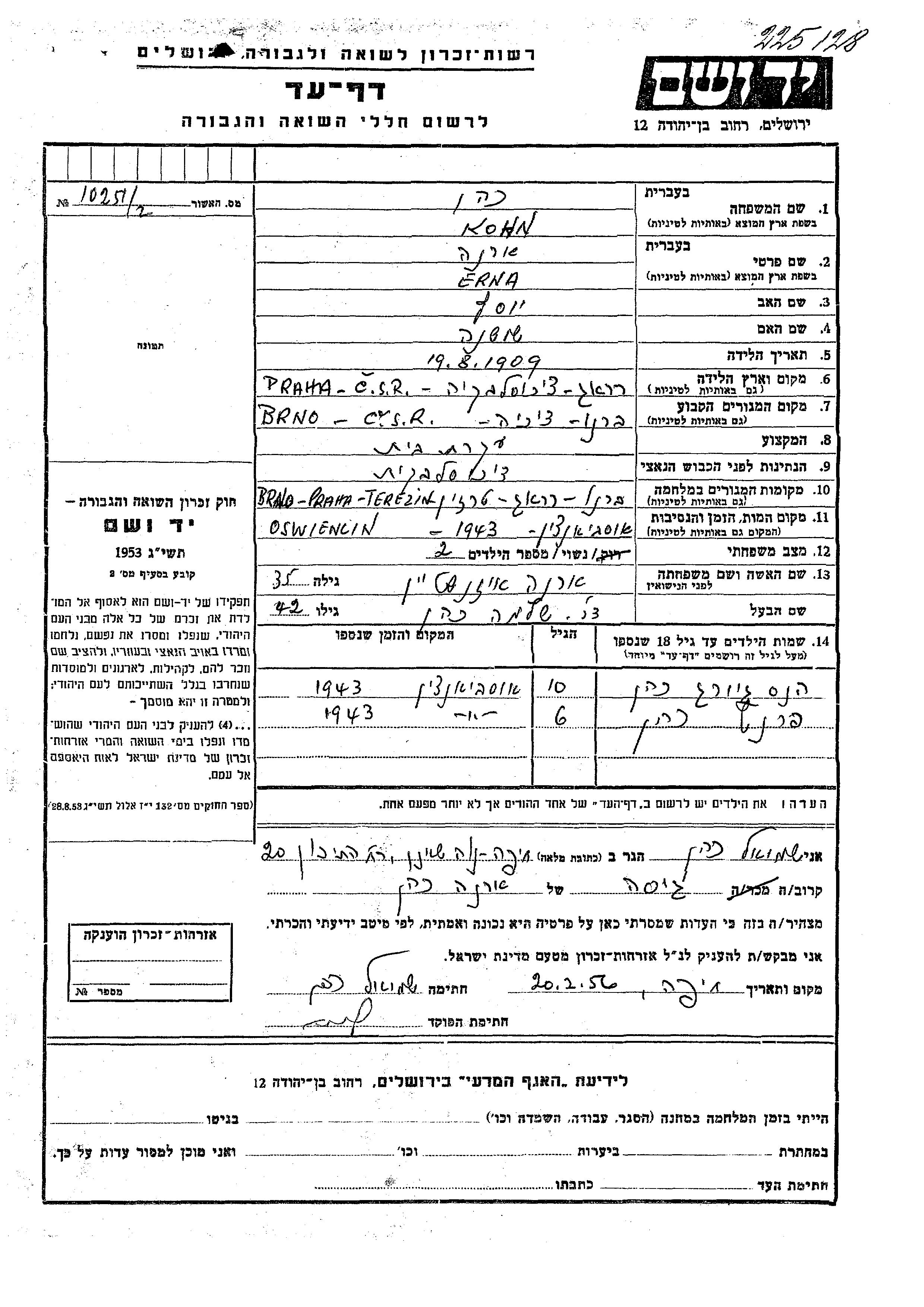 Кон Эрна 1909 Брно, Чехословакия Лист свидетельских показаний