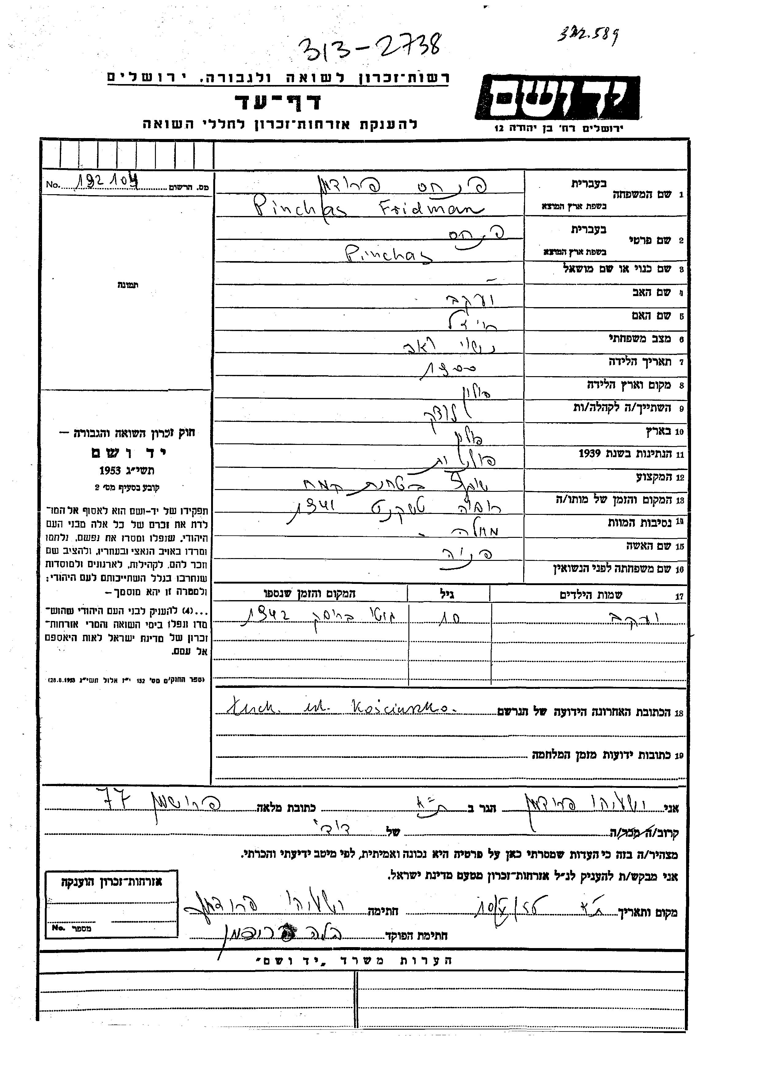 Пинхас Фридман, место рождения: Польша. Отец: Яков, mать:Рейзл. Женат / замужем. Место жительства до войны: Луцк, Польша. Место во время войны: Луцк, Польша. Пинхас был/а зарегистрирован/а, находясь в эвакуации/ в советском тылу.