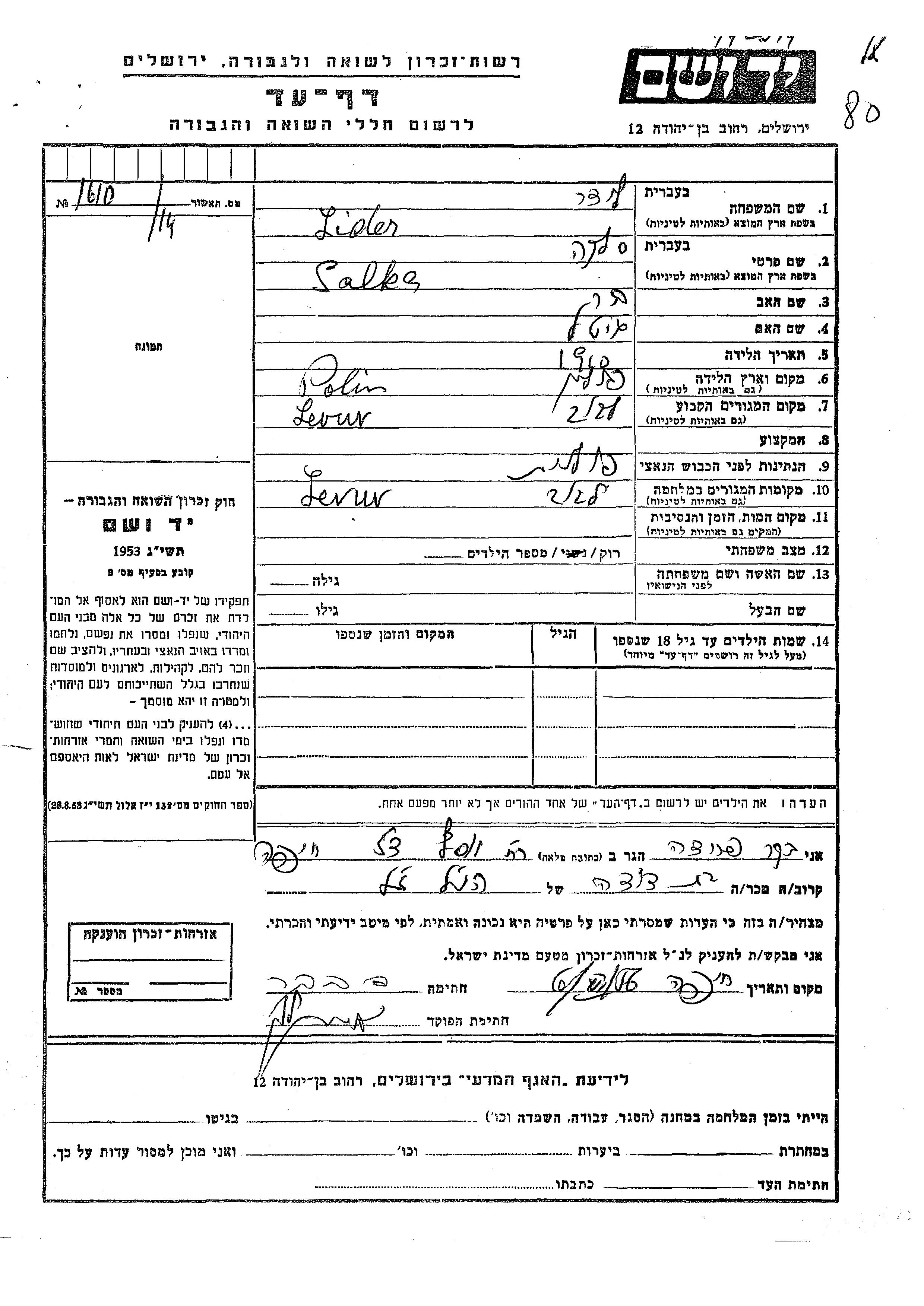 Салька Лидер, место рождения: Польша. Отец: Бер, mать:Гитель. Холост / не замужем. Место жительства до войны: Львов, Польша. Место во время войны: Львов, Польша.