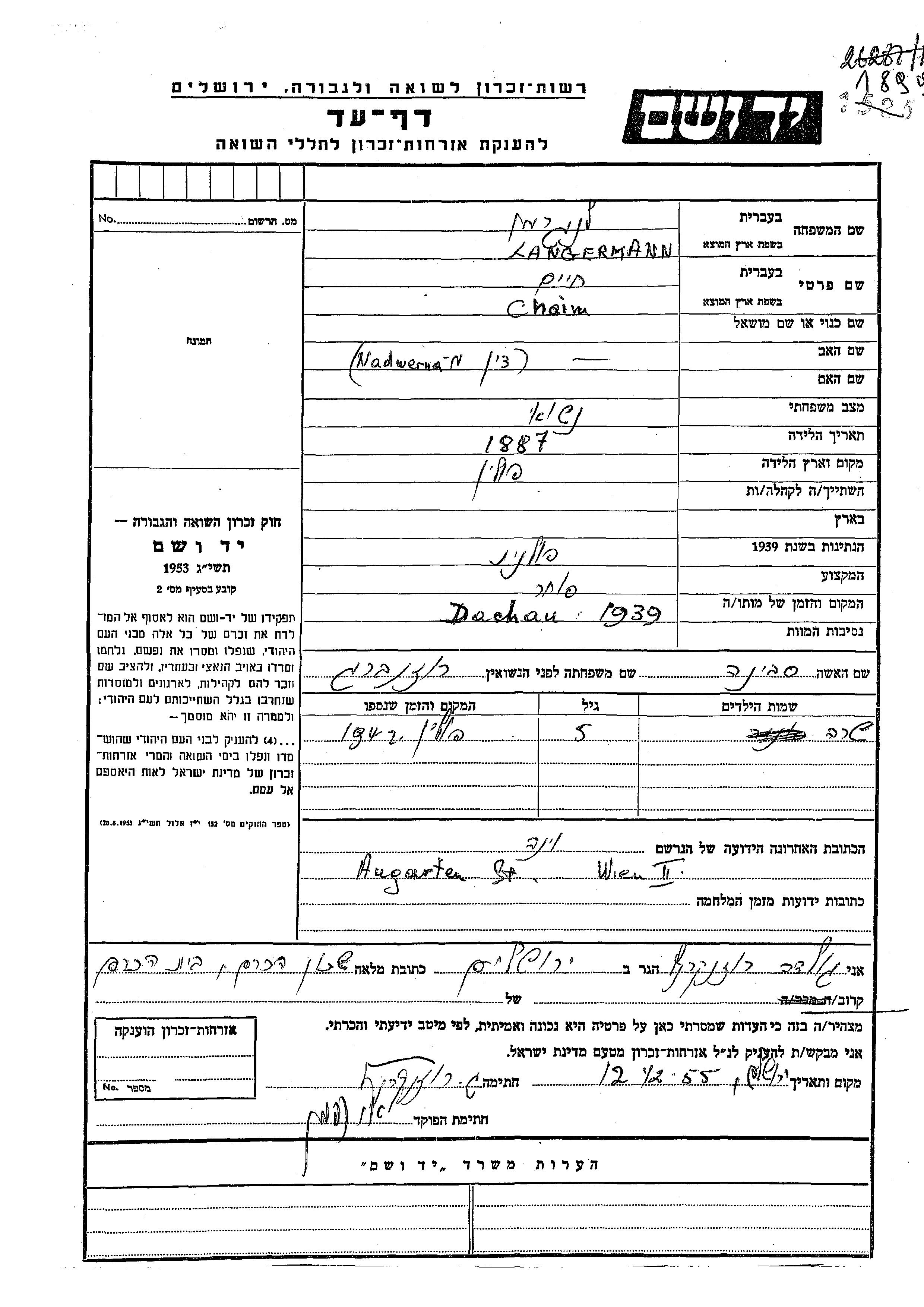 Хаим Лангерманн, место рождения: Польша. Отец: Дон Цион. Торговец / торговка. Женат / замужем. Место жительства до войны: Вена, Австрия. Место во время войны: Вена, Австрия.
