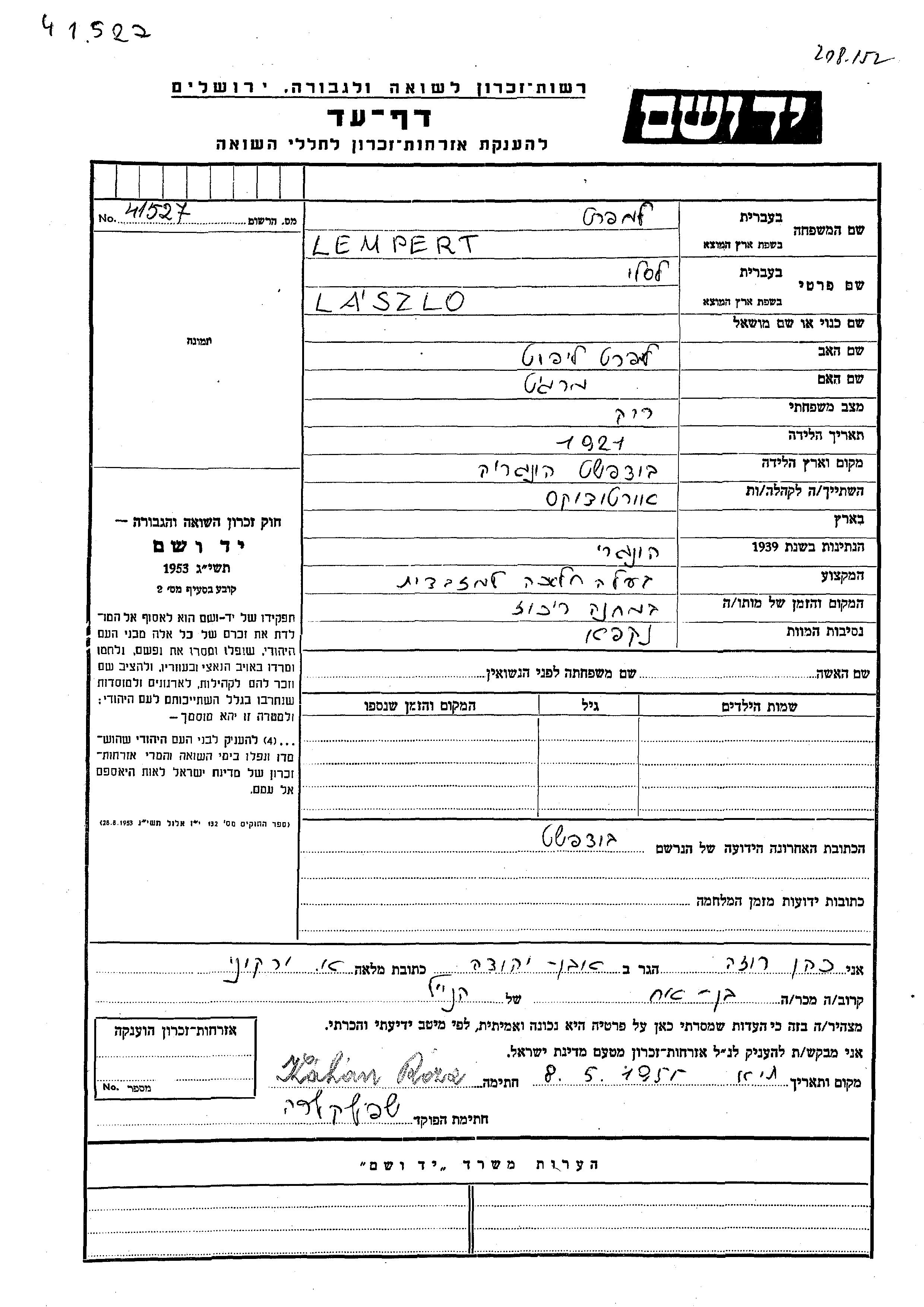 Ласло Лемперт, место рождения: Будапешт, Венгрия. Отец: Липот, mать:Маргит. בעל בית מלאכה למזוודות. Холост / не замужем. Место жительства до войны: Будапешт, Венгрия. Место во время войны: Будапешт, Венгрия.
