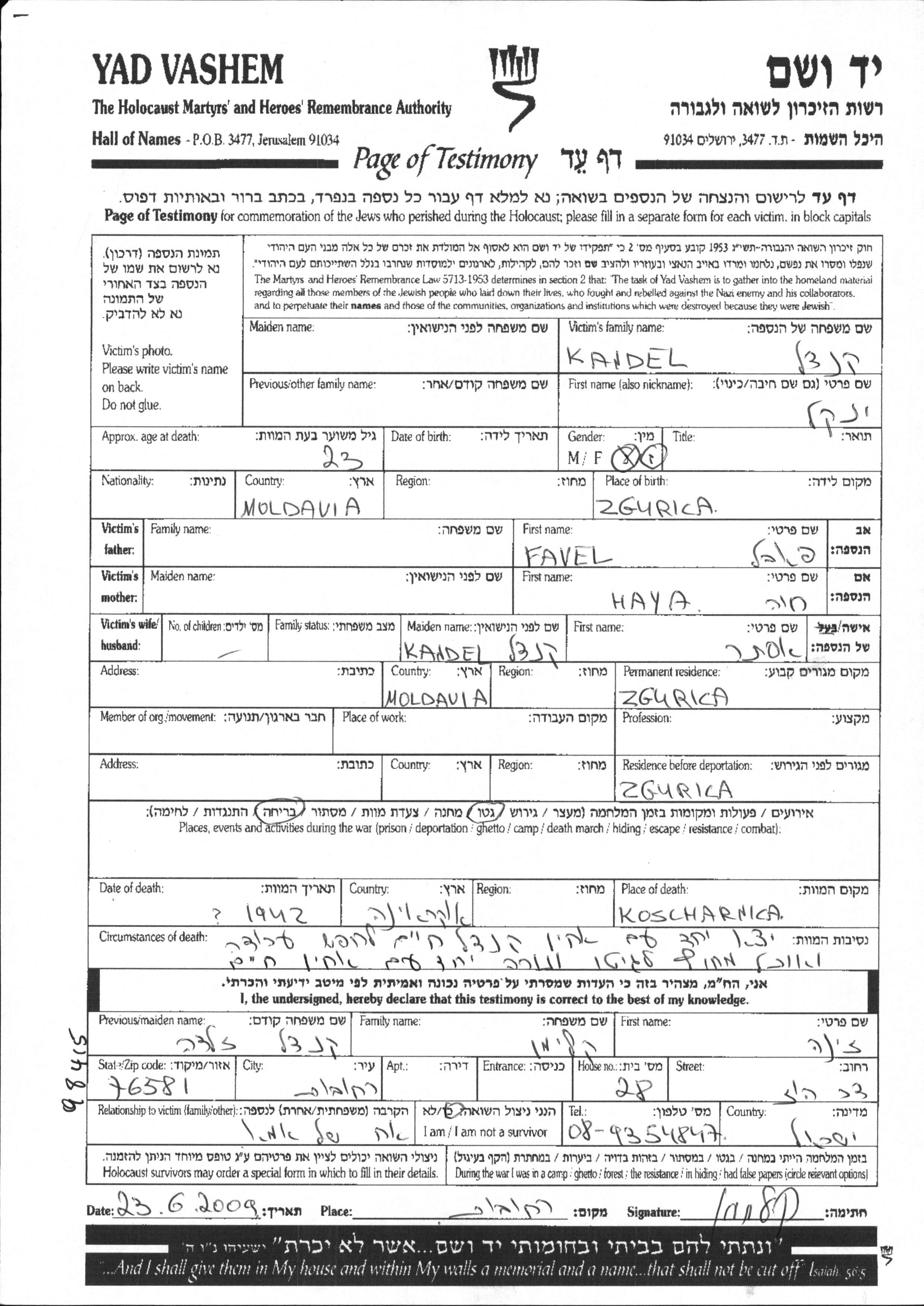 Янкель Кандель, место рождения: Згурица, Румыния. Отец: Фавель, mать:Хая. Женат / замужем. Место жительства до войны: Згурица, Румыния. Место во время войны: ГЕТТО.