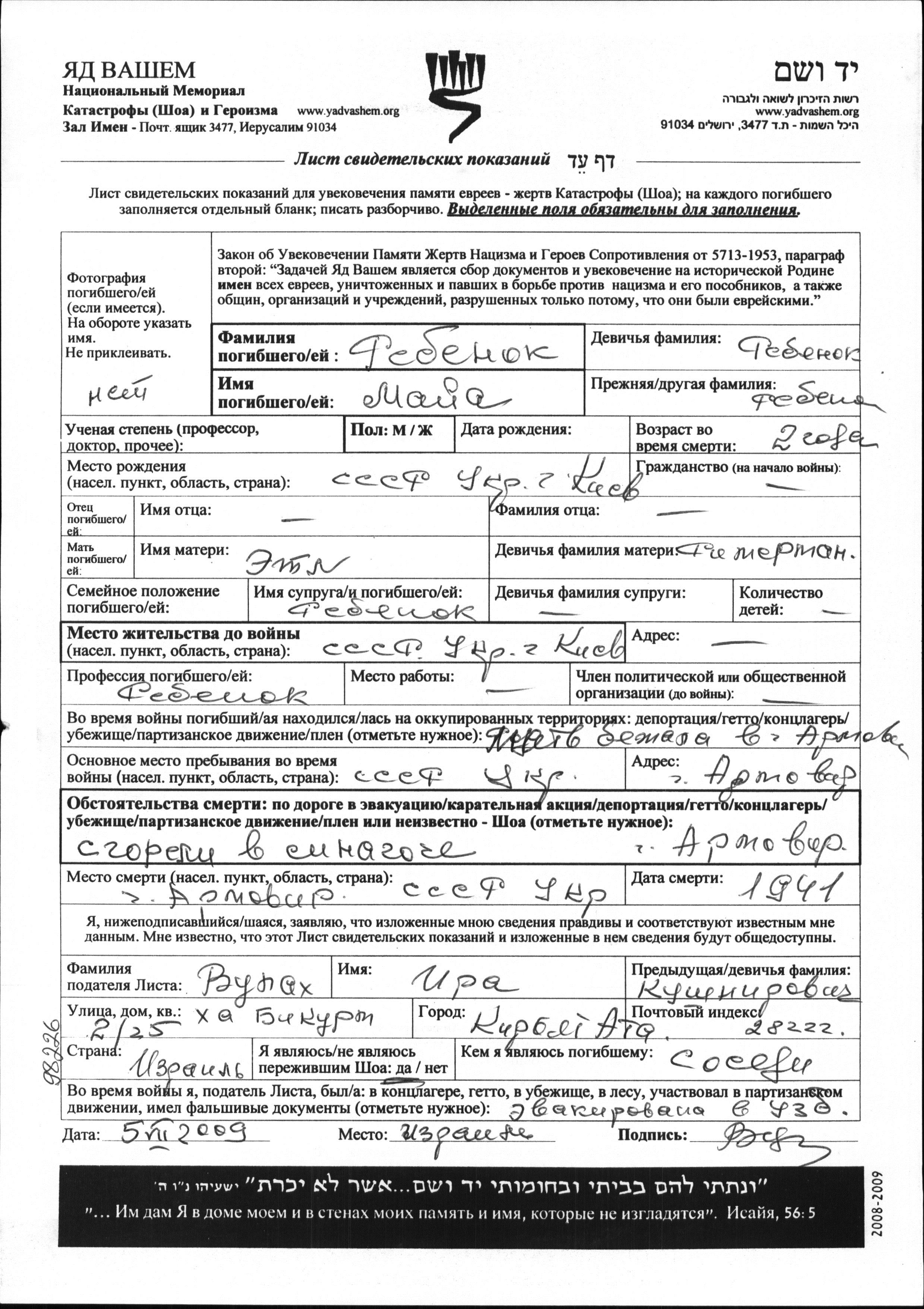 Фамилия неизвестна Маия Киев, Украина (СССР) Лист свидетельских показаний