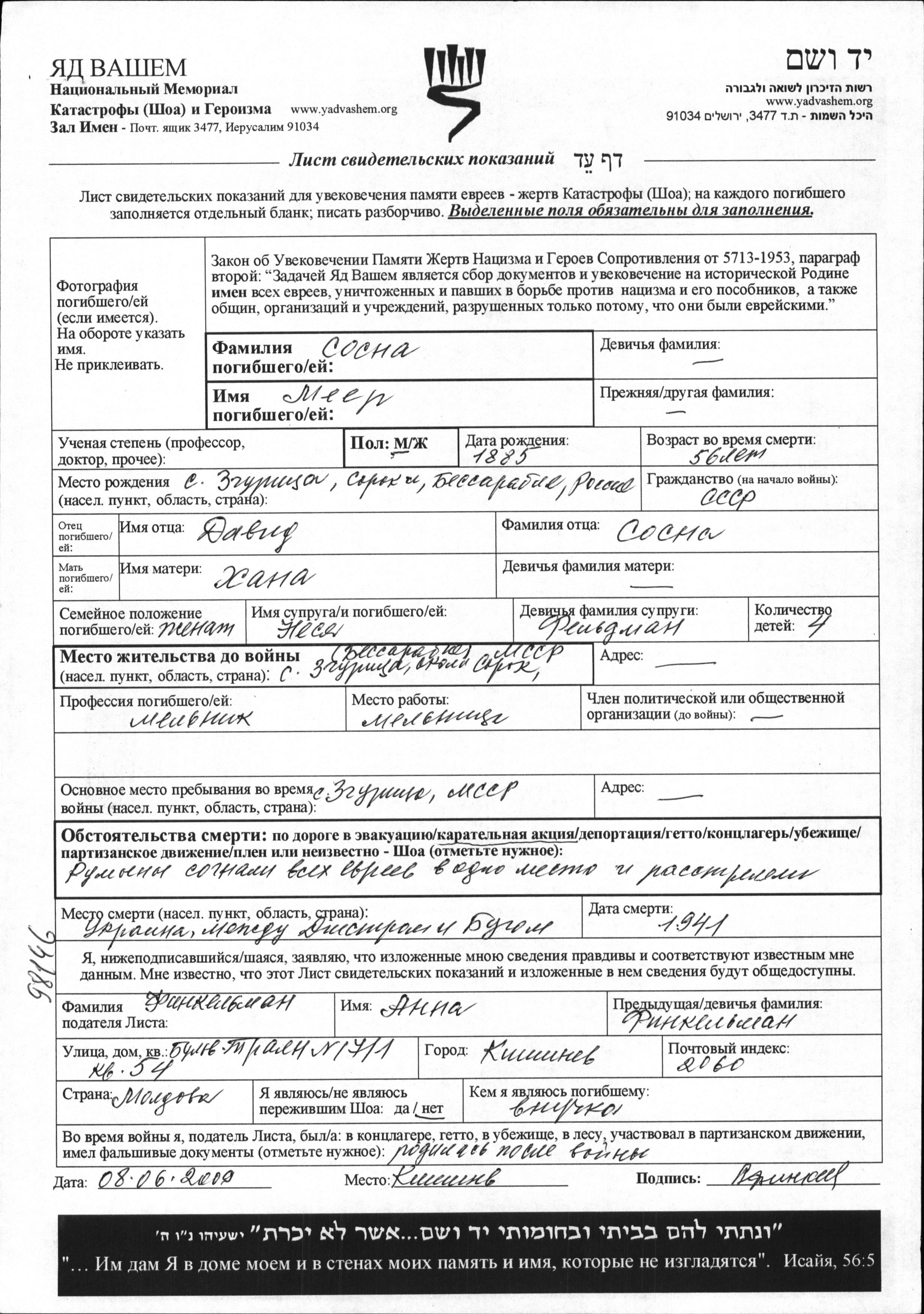 Мейер Сосна, место рождения: Згурица, Румыния. Отец: Давид, mать:Хана. Мельник. Женат / замужем. Место жительства до войны: Згурица, Румыния. Место во время войны: Згурица, Румыния.