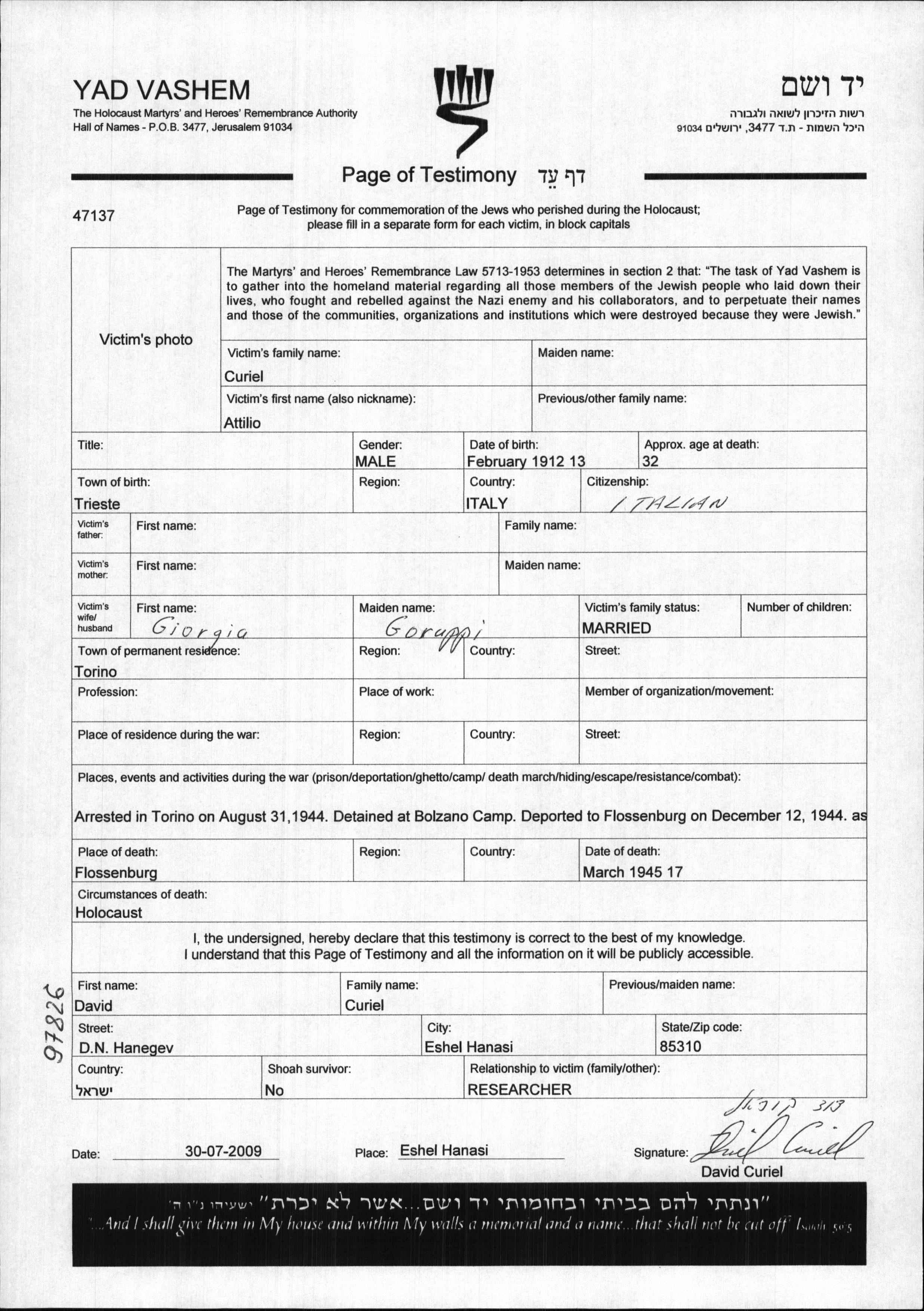 Аттилио Курьель, место рождения: Триест, Италия. Женат / замужем. Место жительства до войны: Турин, Италия. Место во время войны: Больцано, Италия. Аттилио уничтожен в период Шоа. место смерти: Флоссенбюрг, Германия в 17/03/1945.
