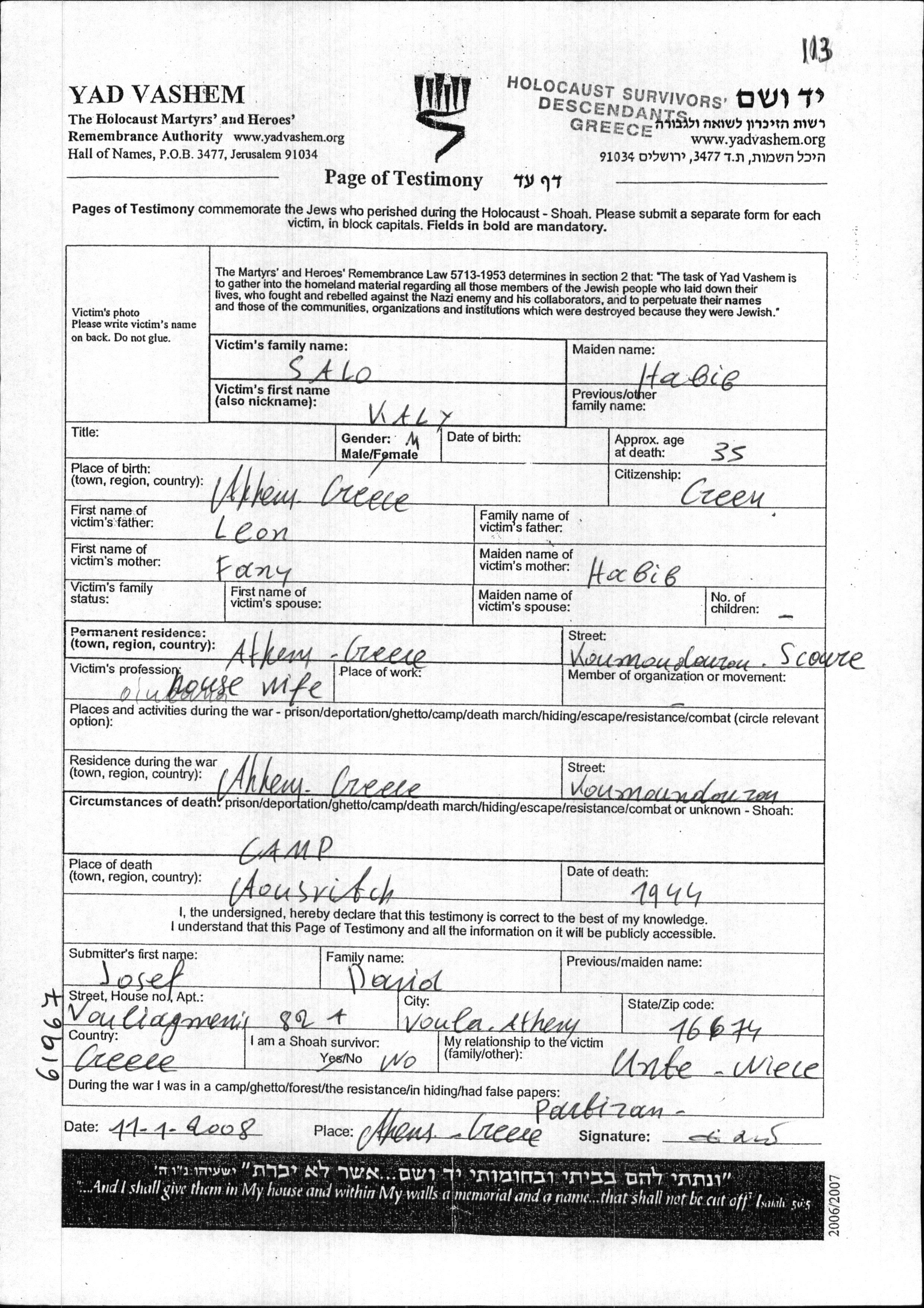 Кейла Сало, девичья фамилия Хабиб, место рождения: Афины, Греция. Отец: Леон, mать:Фани, девичья фамилия Хабиб. Домохозяйка. Место жительства до войны: Афины, Греция. Место во время войны: Афины, Греция.