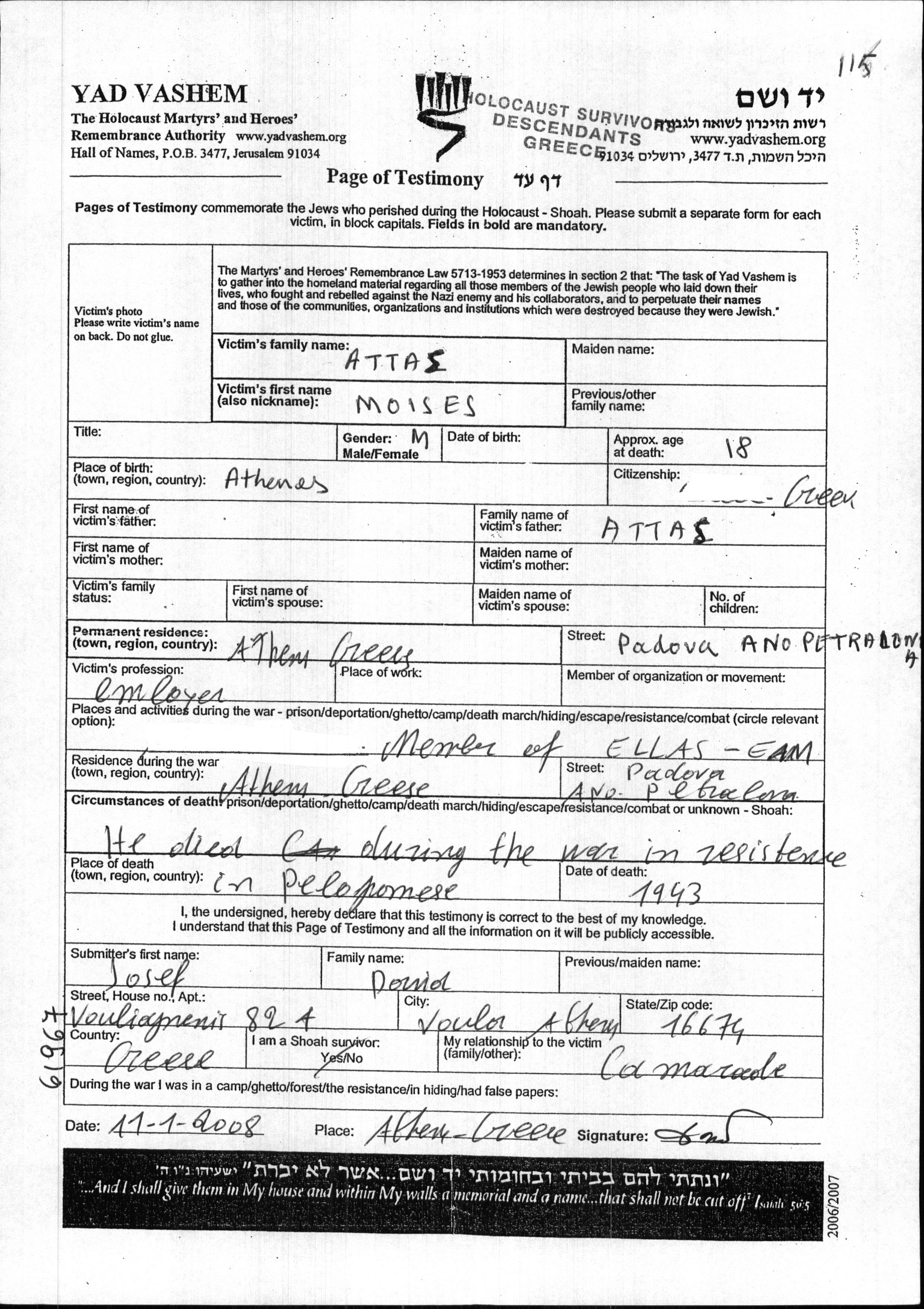 Мойсес Аттас, место рождения: Афины, Греция. Employe. Место жительства до войны: Афины, Греция. Место во время войны: Афины, Греция.