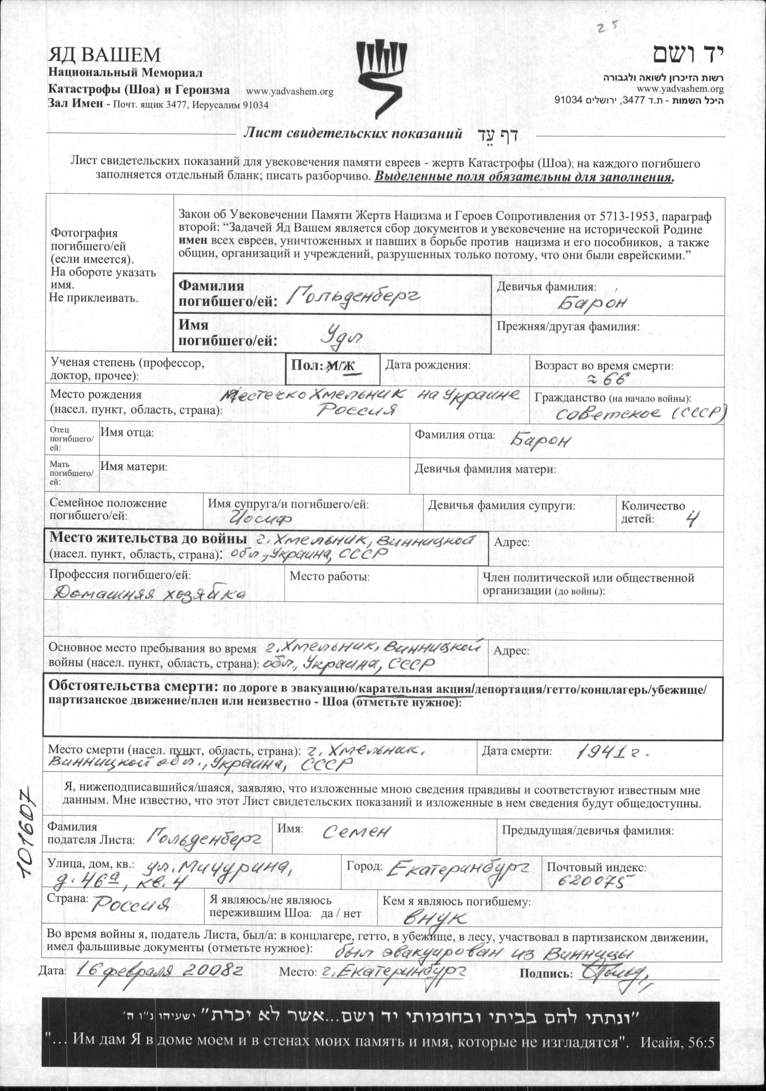 Гольденберг Удл Хмельник, Украина (СССР) Лист свидетельских показаний