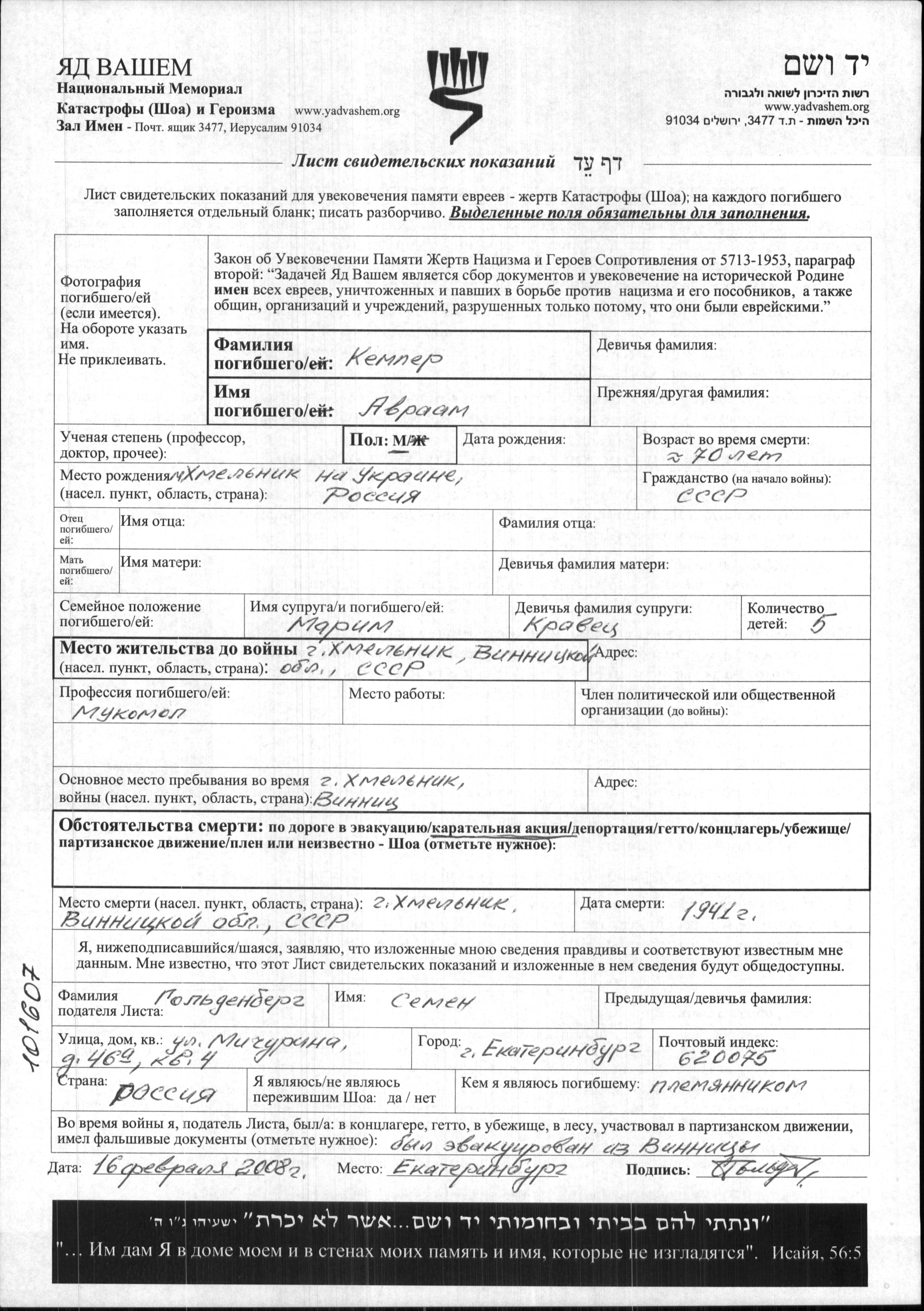 Кемпер Авраам Хмельник, Украина (СССР) Лист свидетельских показаний