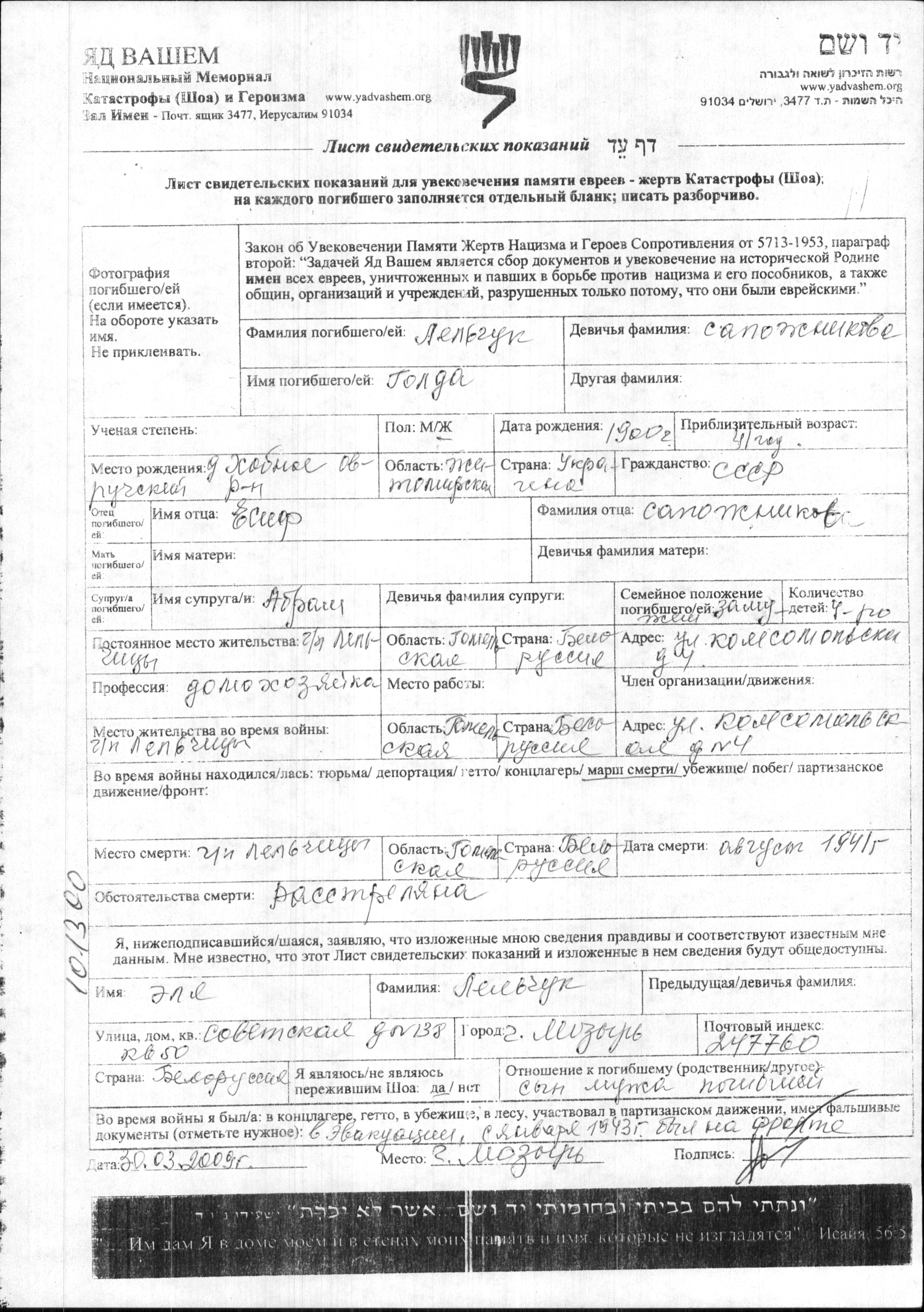 Яд Вашем - Листы свидетельских показаний Мемориального фонда