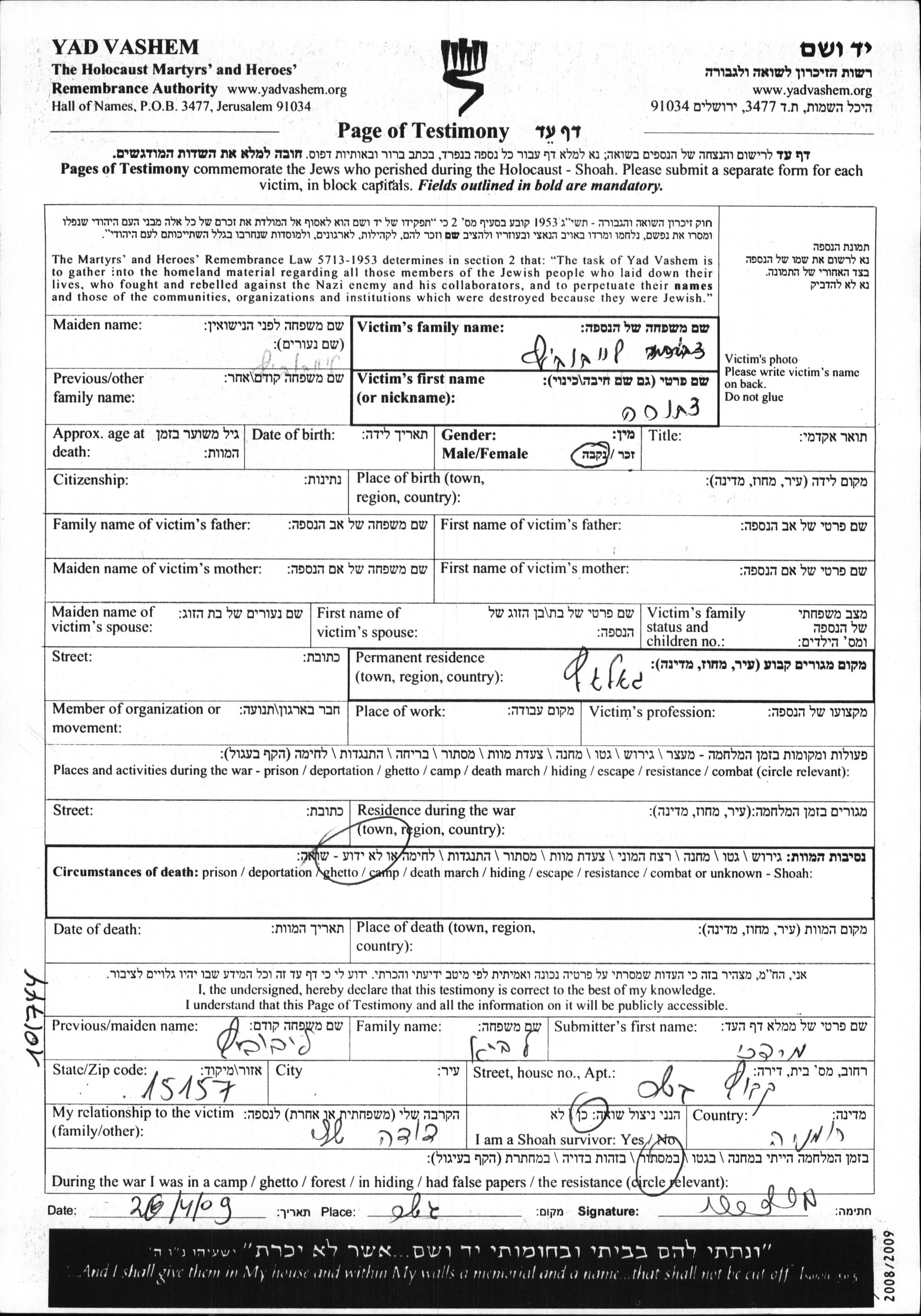 Яд Вашем - Листы свидетельских показаний Мемориального фонда
