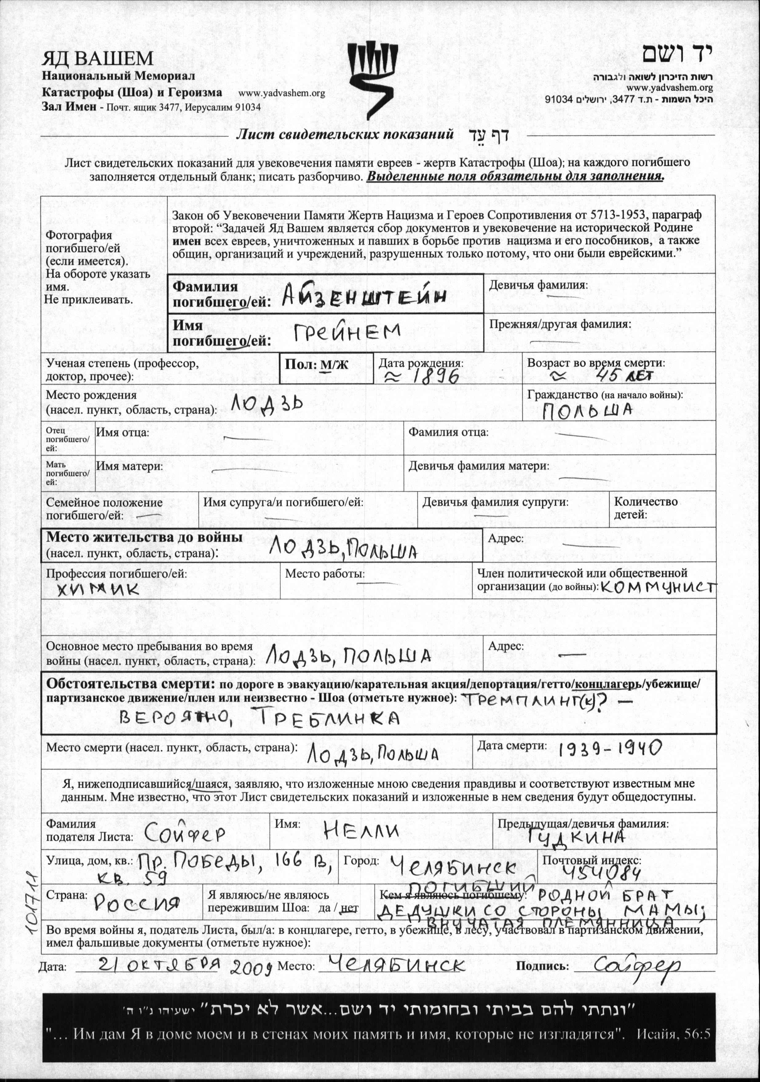 Айзенштейн Грейним 1896 Лодзь, Польша Лист свидетельских показаний