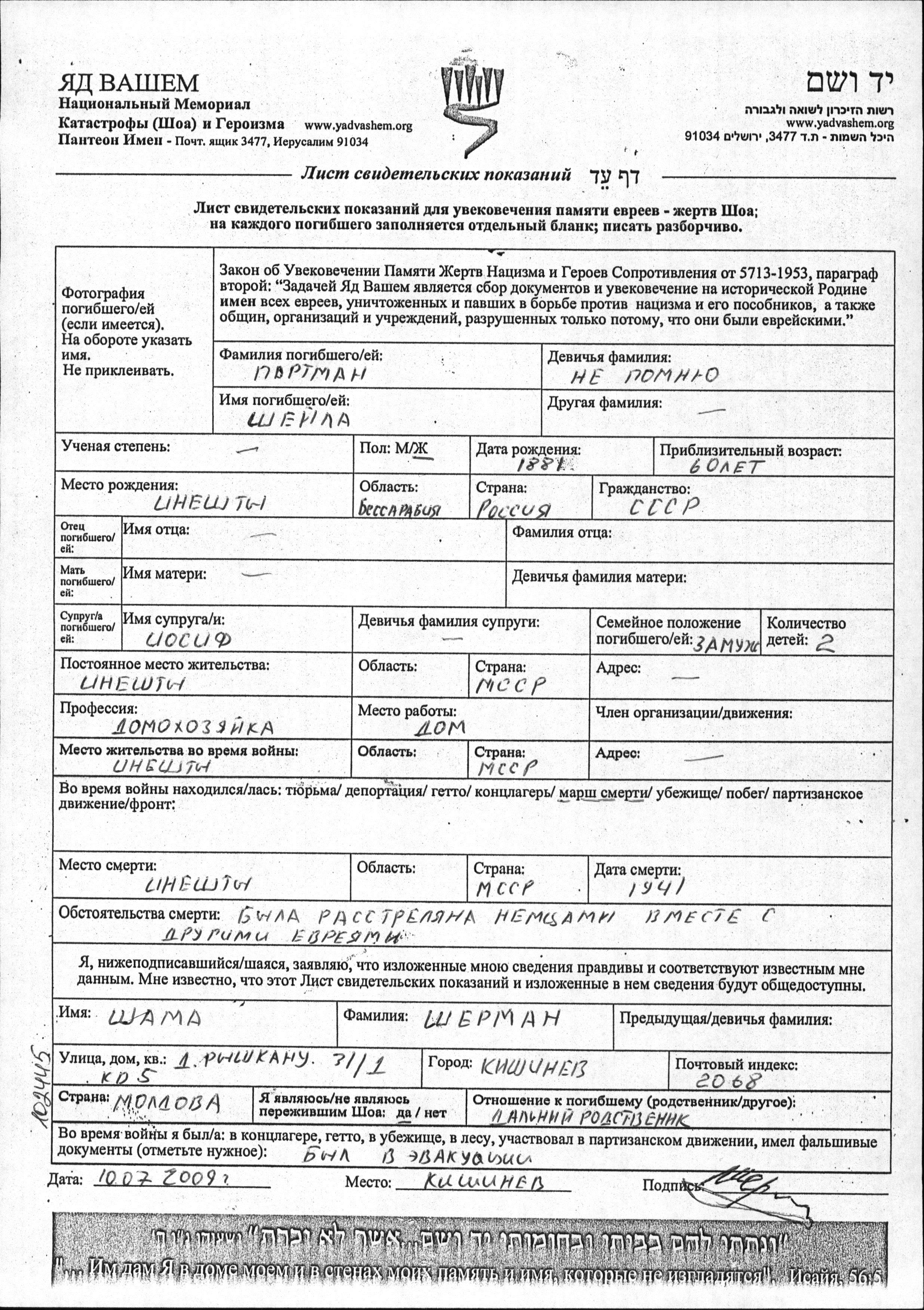 Яд Вашем - Листы свидетельских показаний Мемориального фонда