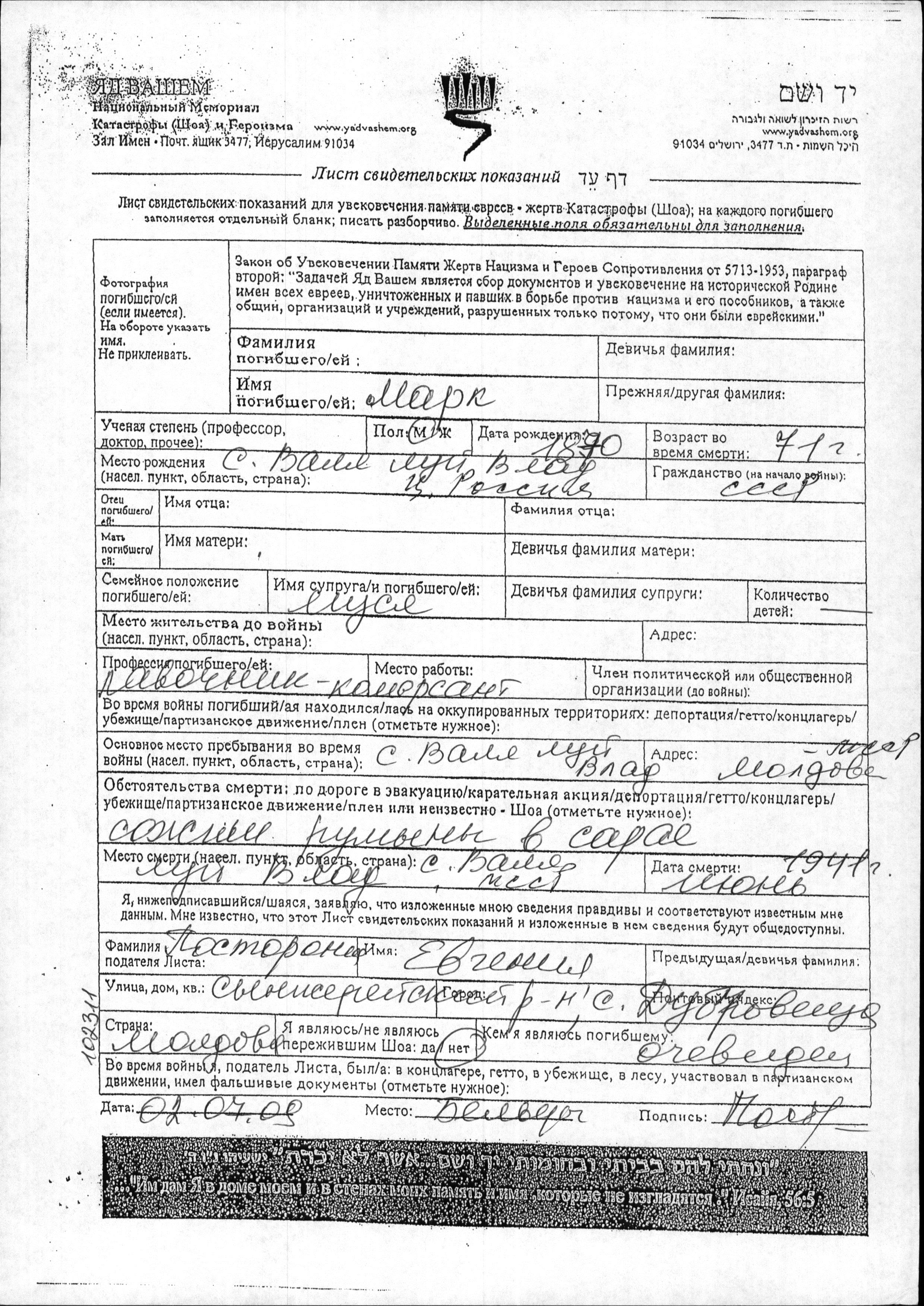Марк Фамилия неизвестна, место рождения: Валя-Луй-Влад, Румыния. Владелец / владелица продуктового магазина. Женат / замужем. Место жительства до войны: Валя-Луй-Влад, Румыния. Место во время войны: Валя-Луй-Влад, Румыния. Марк уничтожен в период Шоа. место смерти: Валя-Луй-Влад, Румыния в 06/1941.