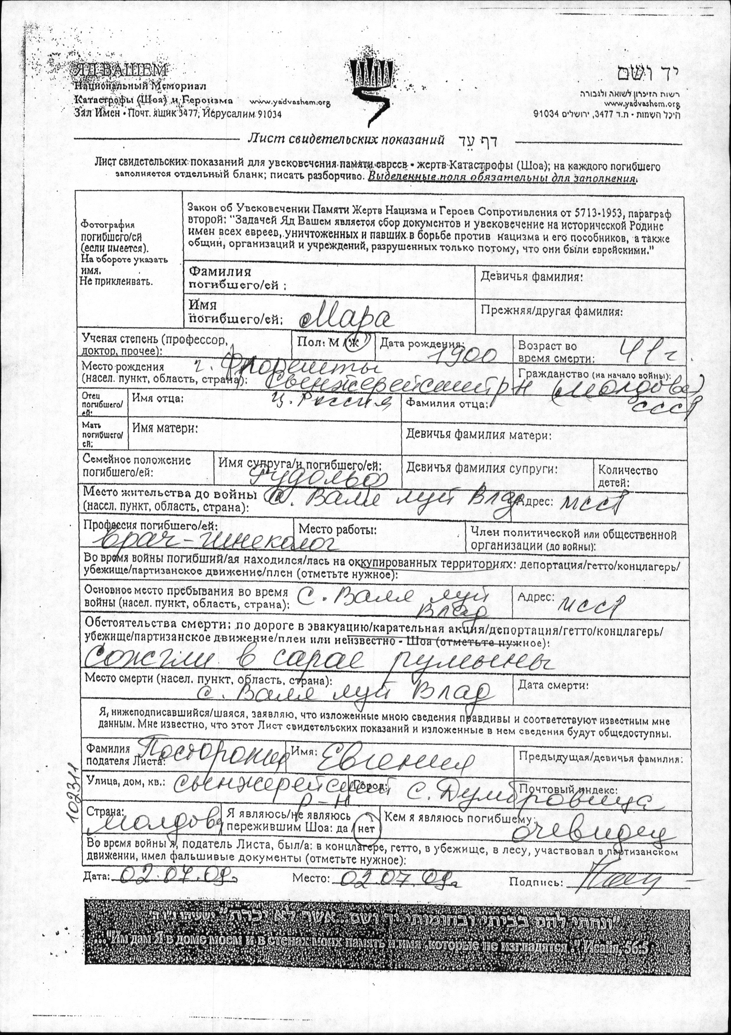 Мара Фамилия неизвестна, место рождения: Флорешть, Румыния. Врач. Женат / замужем. Место жительства до войны: Валя-Луй-Влад, Румыния. Место во время войны: Валя-Луй-Влад, Румыния. Мара уничтоженa в период Шоа. место смерти: Валя-Луй-Влад, Румыния в 1941.