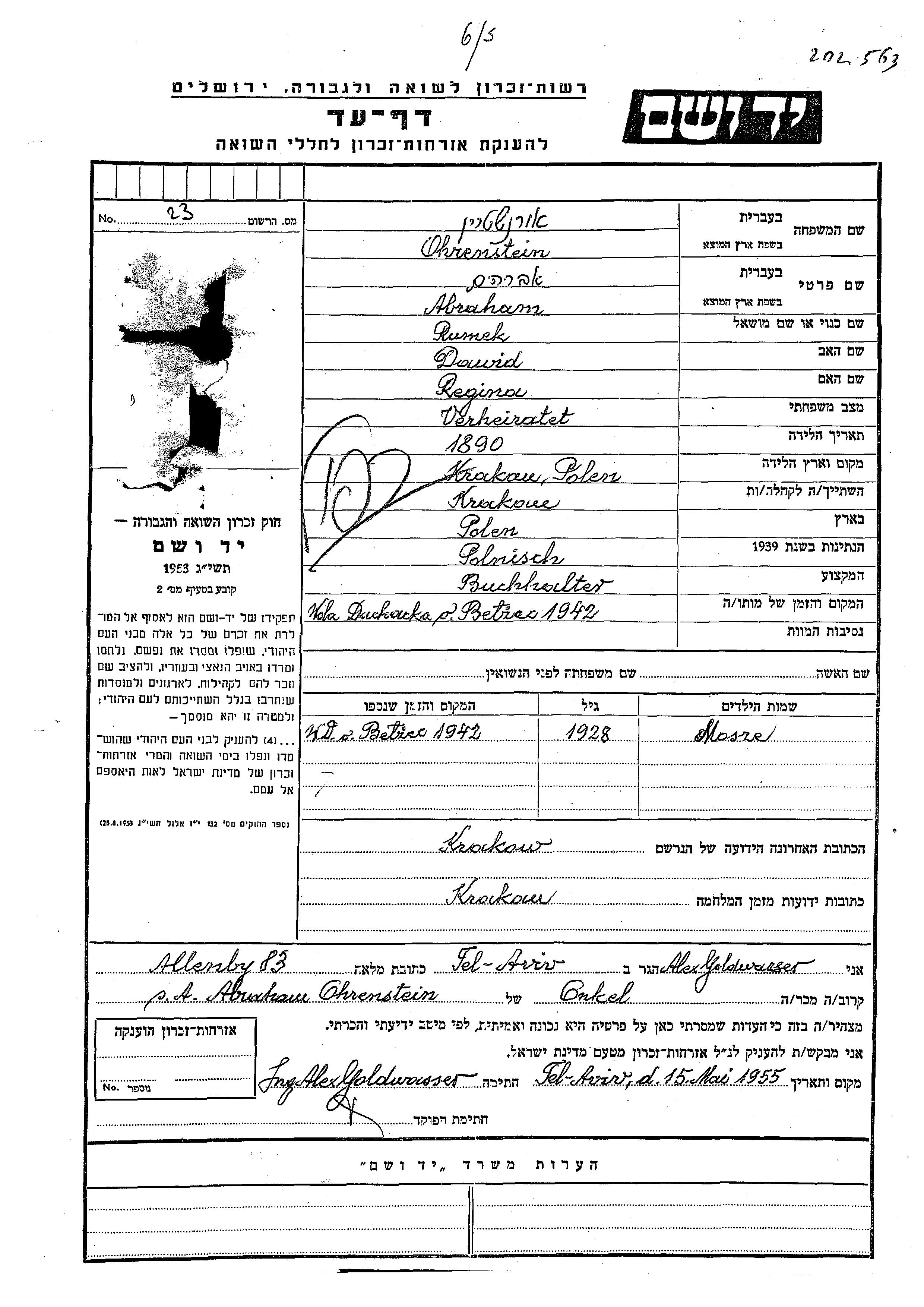 Оренштайн Моше 1928 Краков, Польша Лист свидетельских показаний