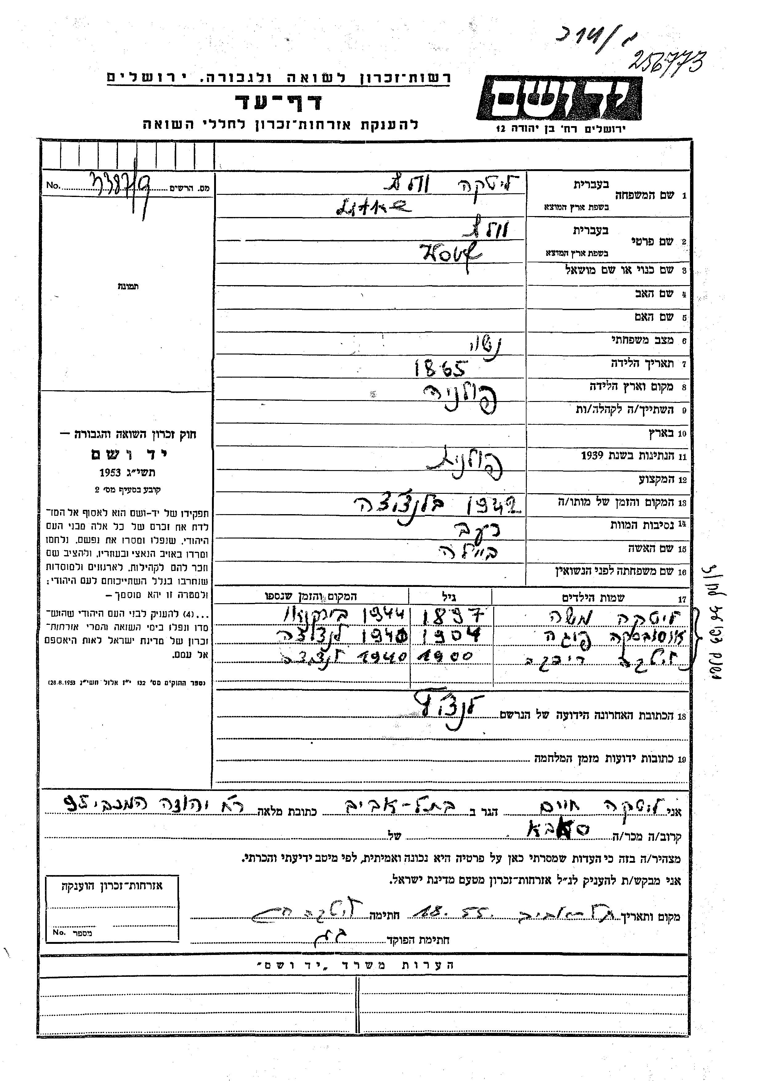 Яд Вашем - Листы свидетельских показаний Мемориального фонда