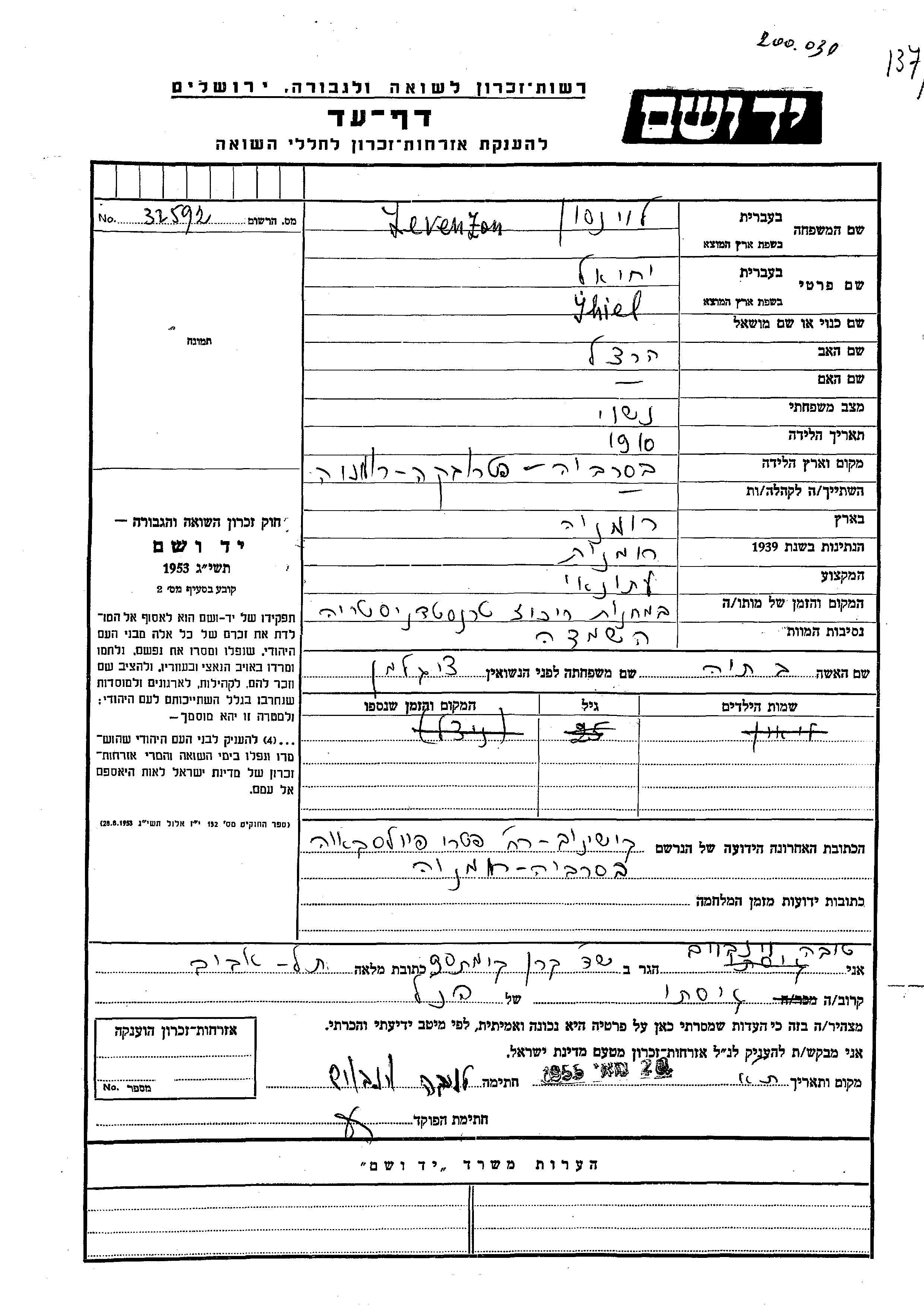 Левензон Лион Румыния Лист свидетельских показаний