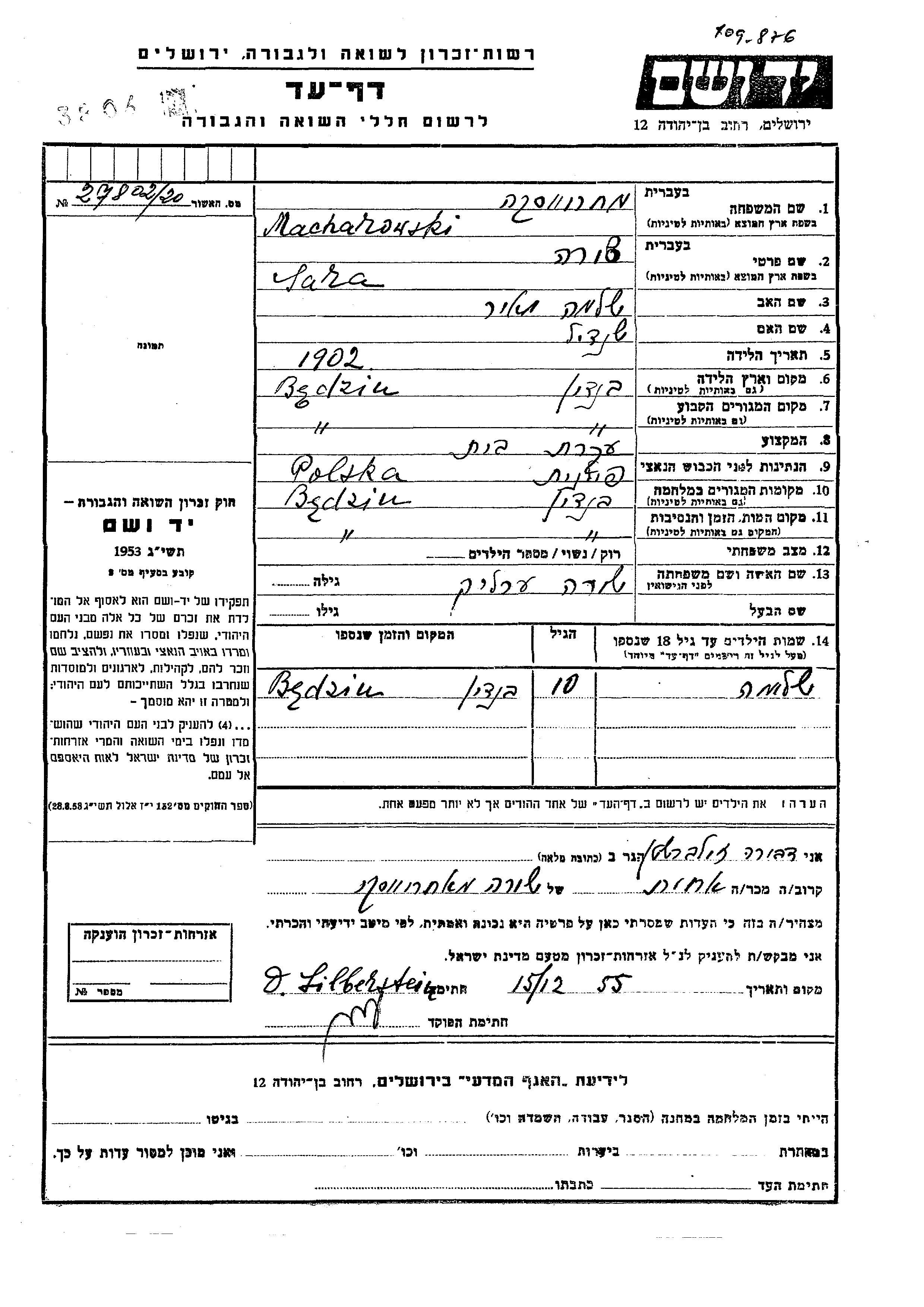 Махаровски Шломо Бендзин, Польша Лист свидетельских показаний