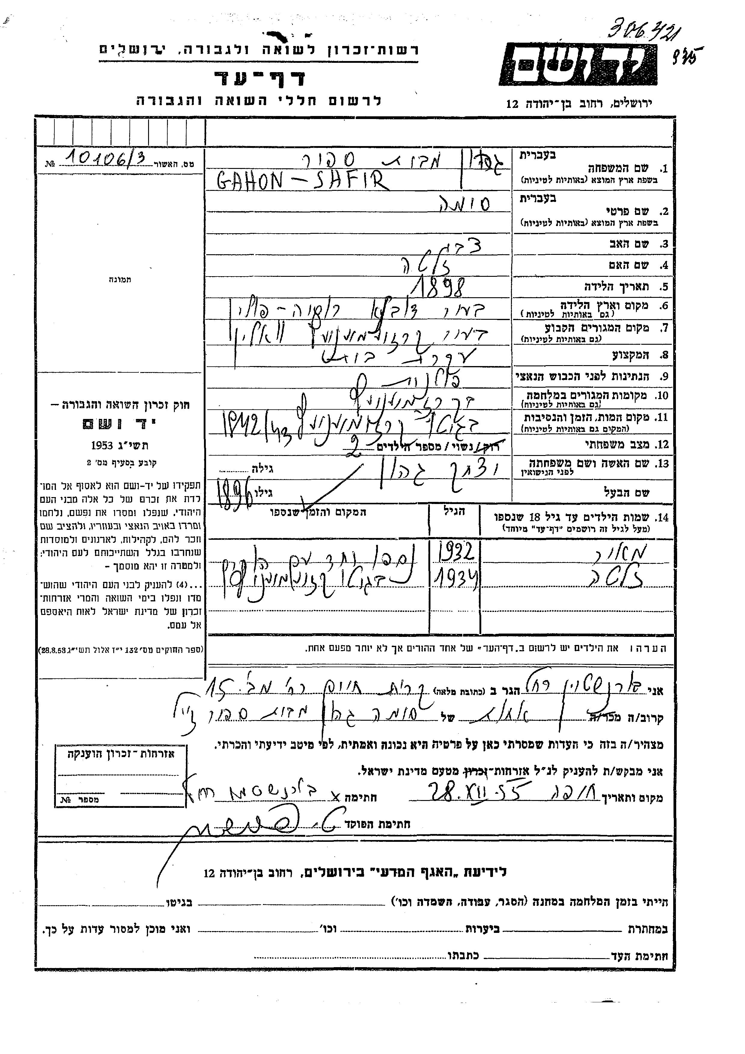 Яд Вашем - Листы свидетельских показаний Мемориального фонда