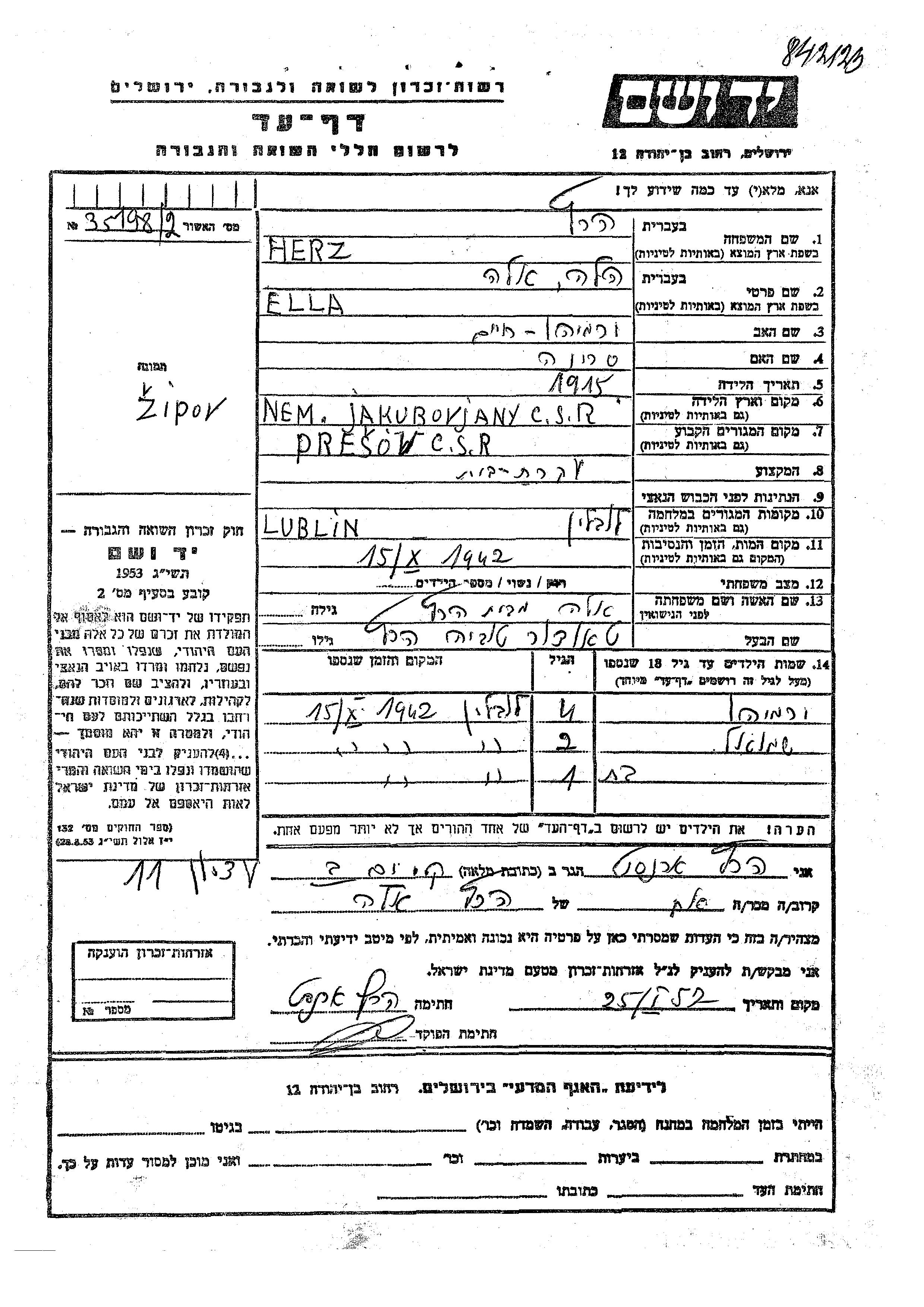 Шмуэль Херц Теодор Тувия Элла Хела девичья фамилия Херц. Ребенок. Место жительства до войны: Прешов, Чехословакия. Место во время войны: Люблин, Польша.