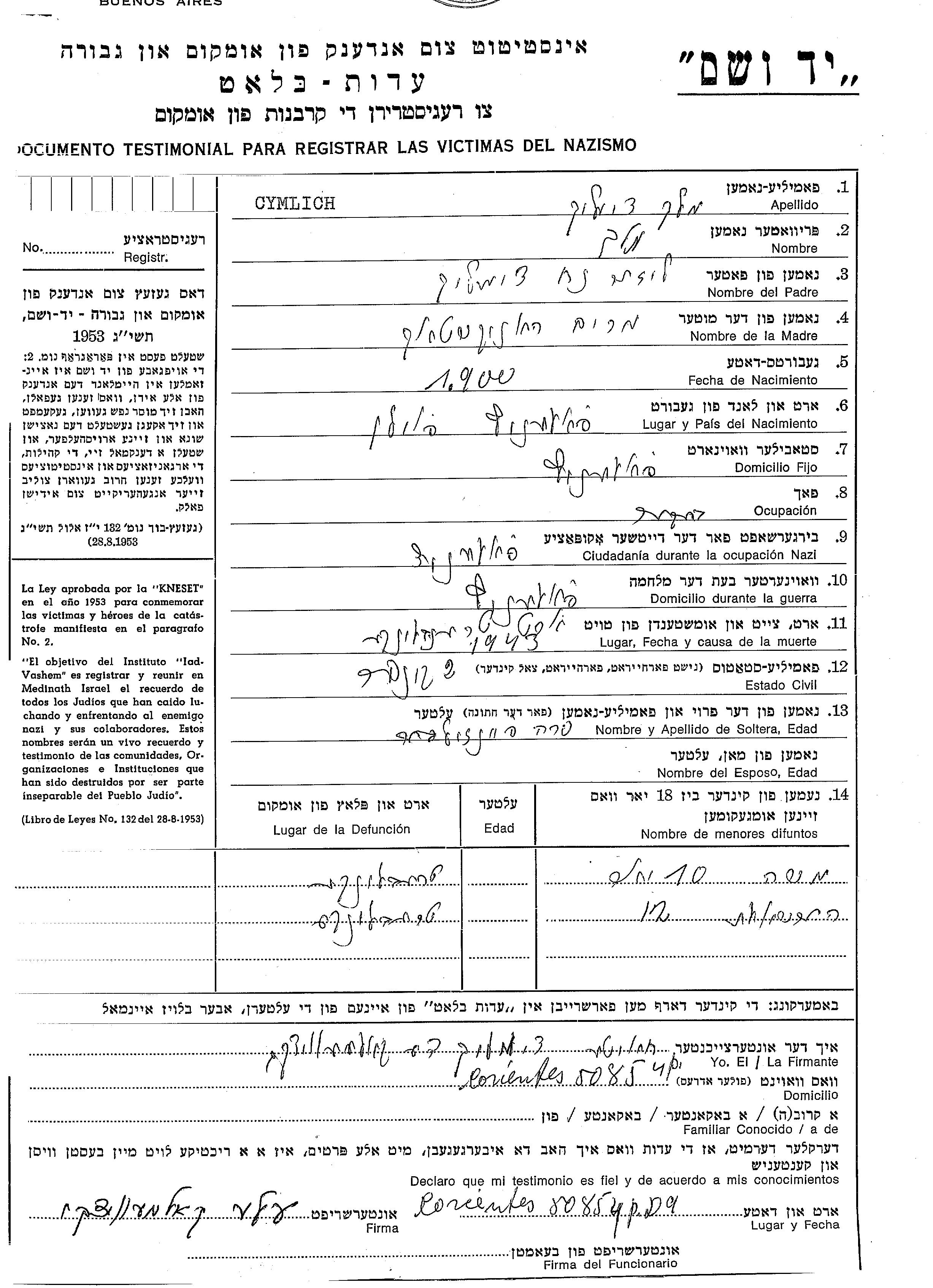 Цымлих Моше Паленец, Польша Лист свидетельских показаний