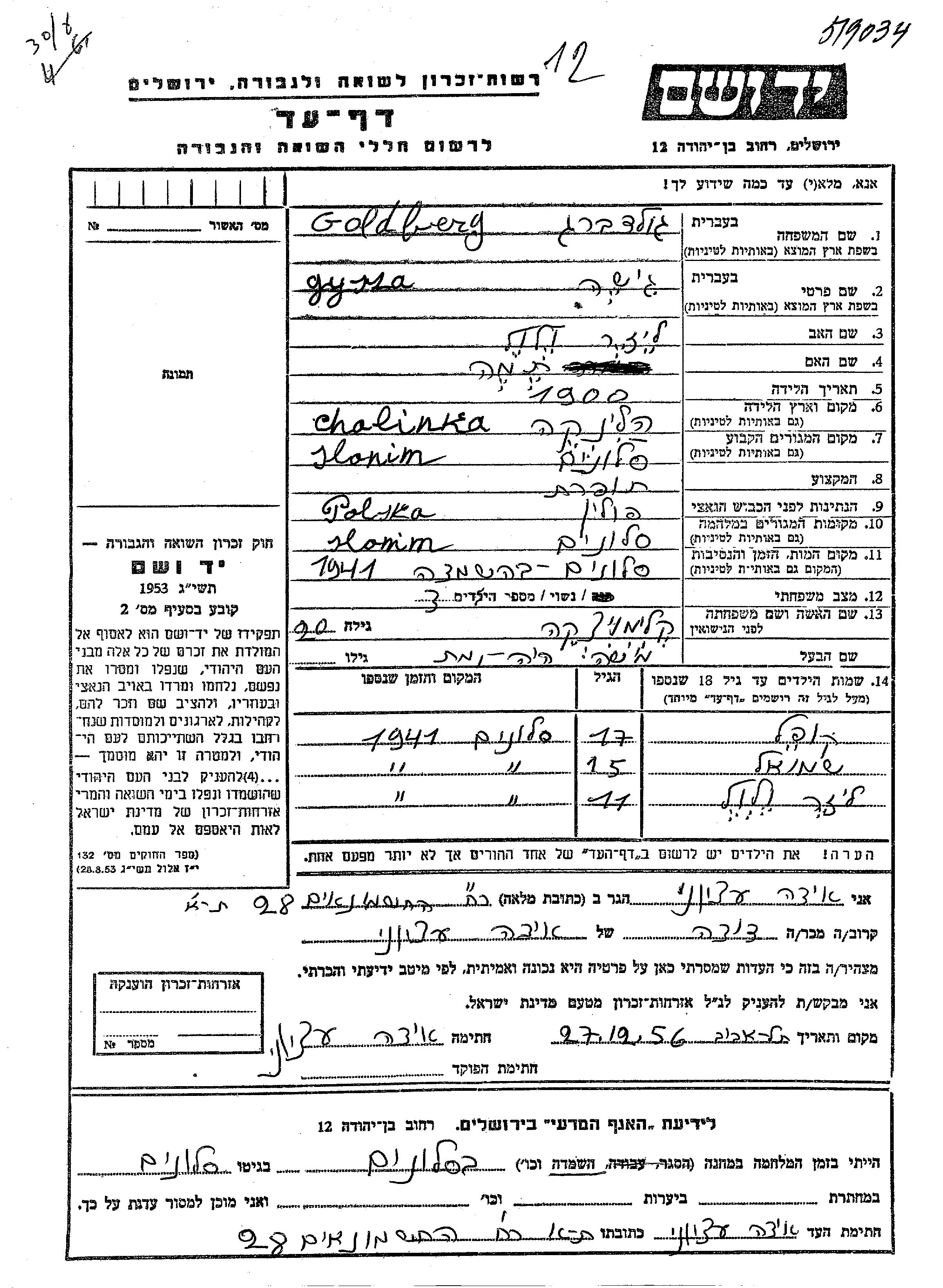 Гольдберг Копель Слоним, Польша Лист свидетельских показаний