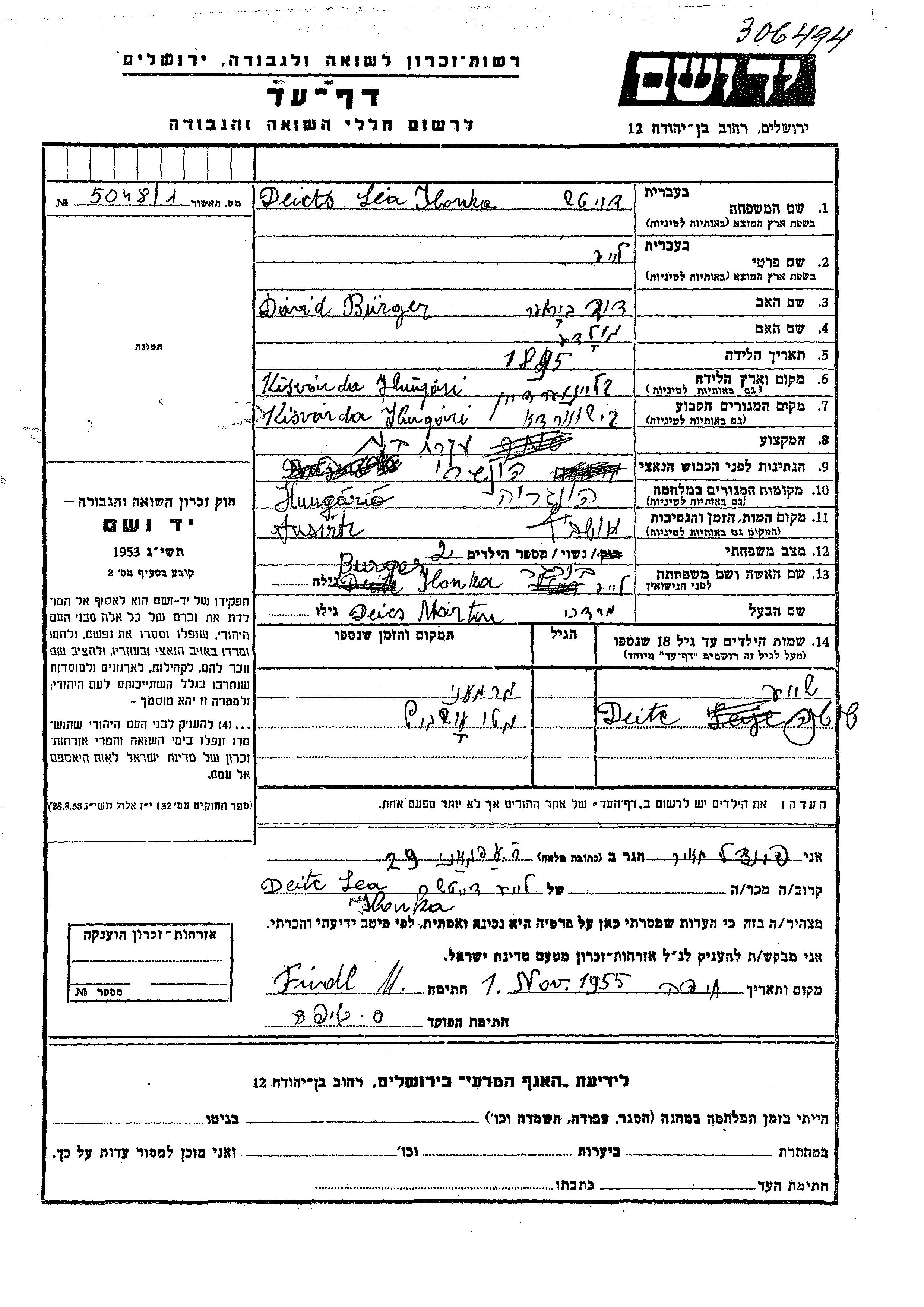Шошана Дейч Мордехай Илонка Лея девичья фамилия Бургер. Ребенок. Место жительства до войны: Кишварда, Венгрия. Место во время войны: Венгрия.