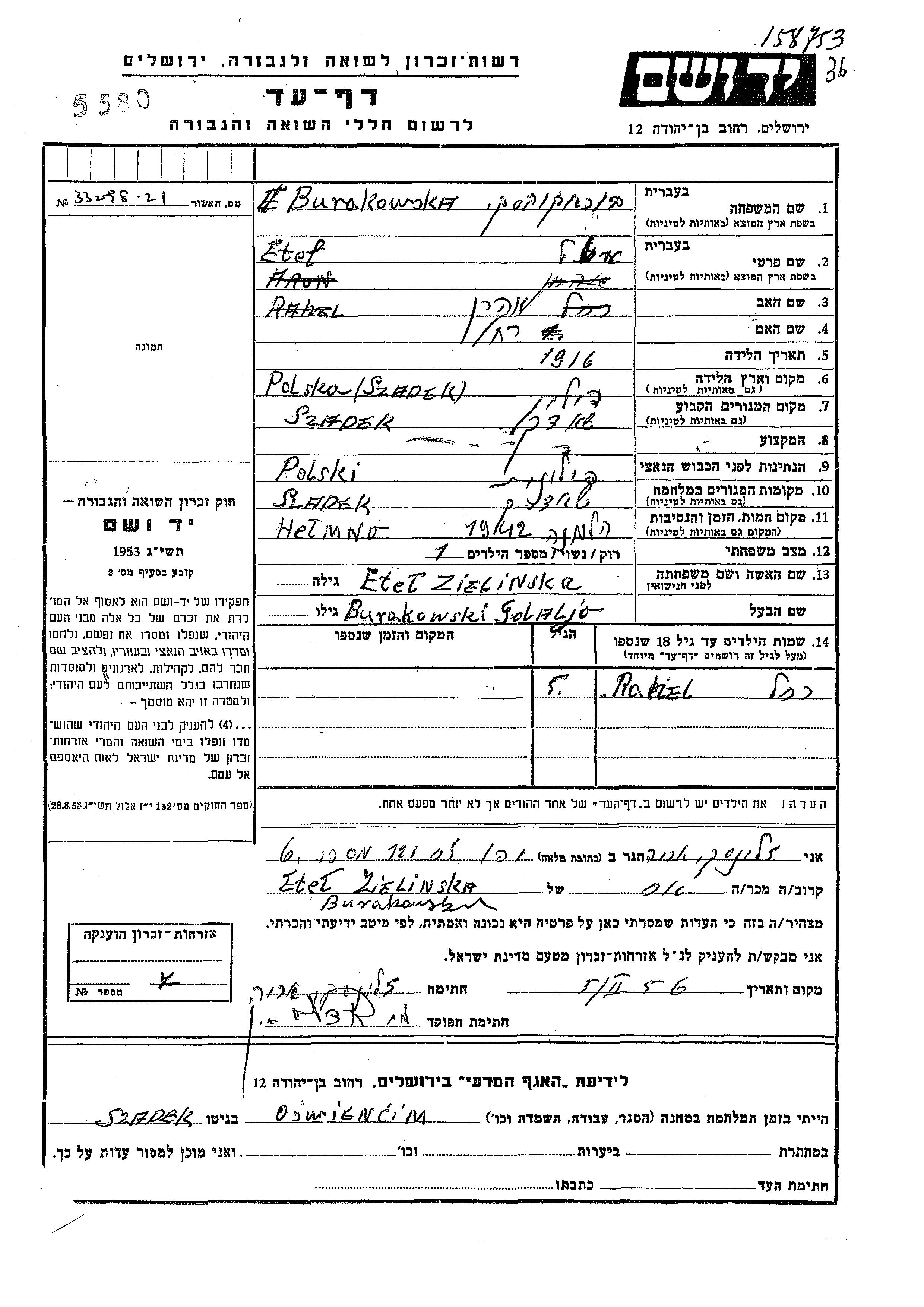 Рахель Бураковска Гедалия Этель Итель девичья фамилия Желинска. Ребенок. Место жительства до войны: Шадек, Польша. Место во время войны: Шадек, Польша.