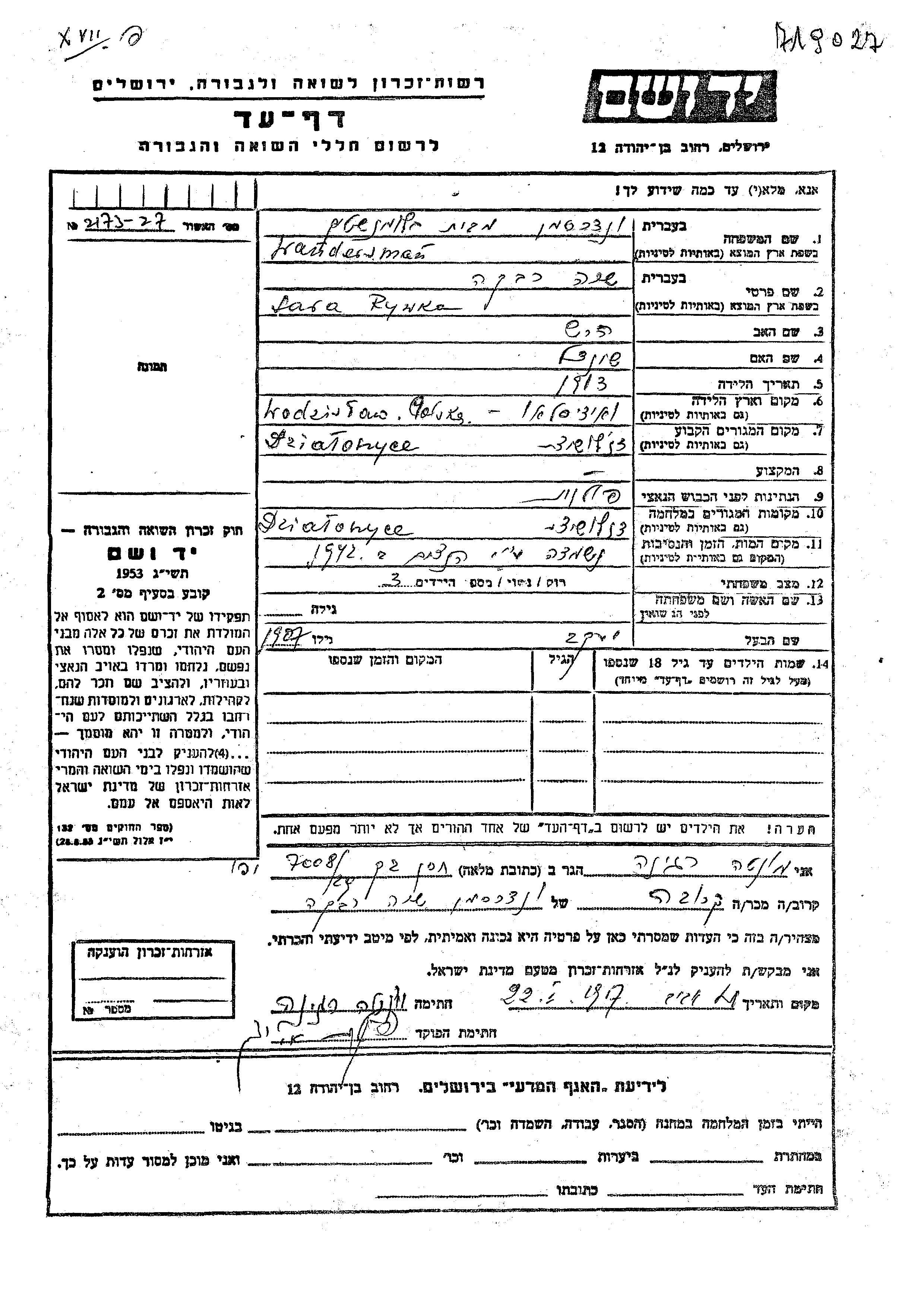 Вандерсман Ривка Сара 1913 Дзялошице, Польша Лист свидетельских показаний