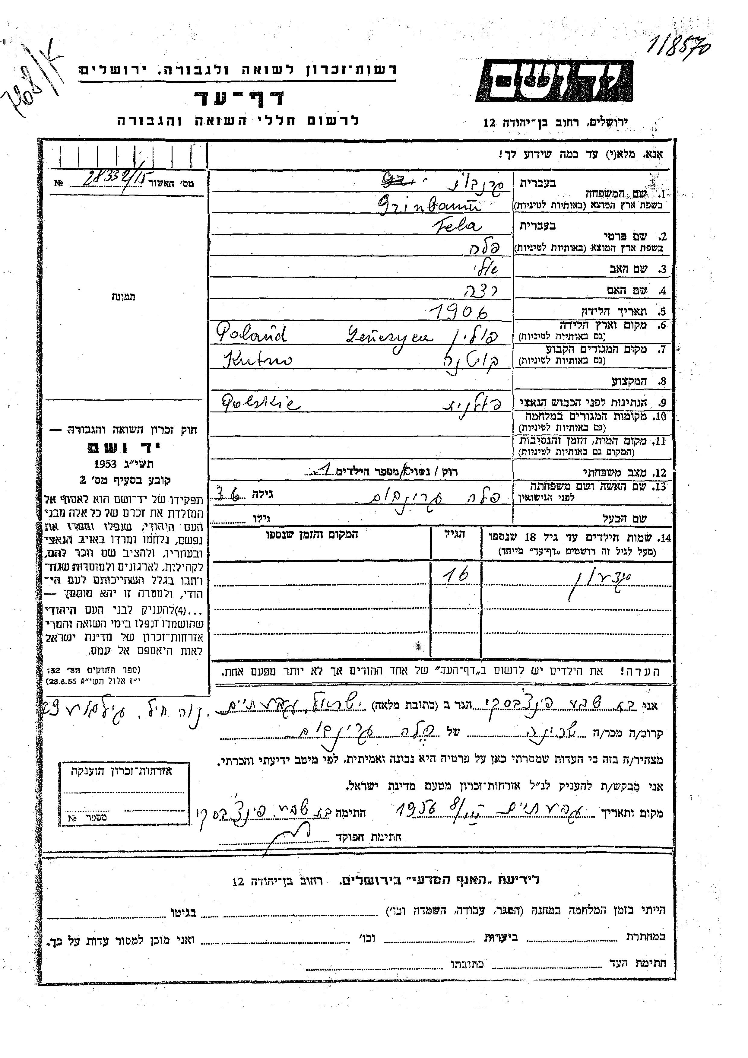 Гидеон Гринбойм Фела девичья фамилия Гринбойм. Ребенок. Место жительства до войны: Кутно, Польша.