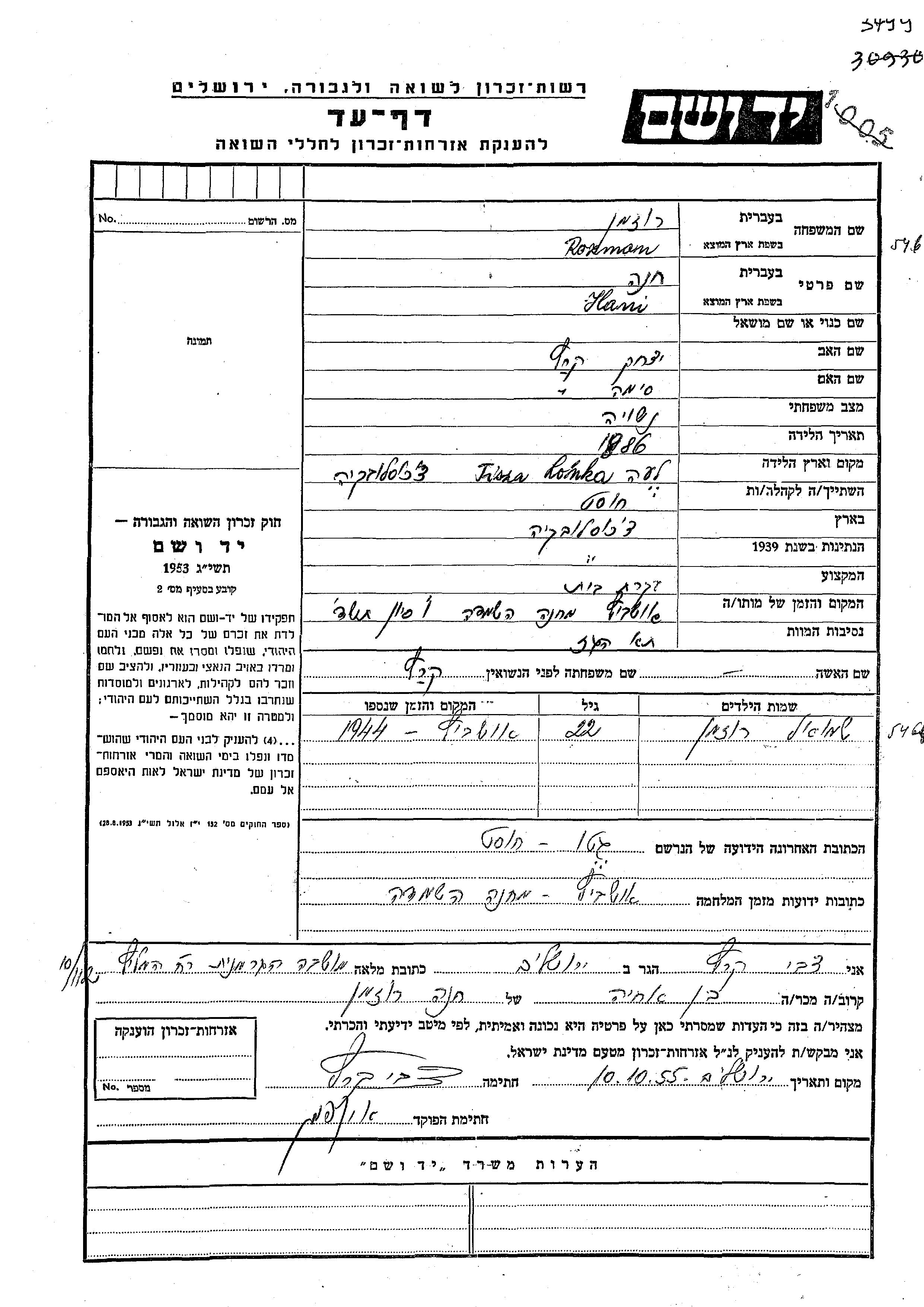 Шмуэль Розман Хани девичья фамилия Крец. Место жительства до войны: Хуст, Чехословакия. Место во время войны: Хуст, Чехословакия.