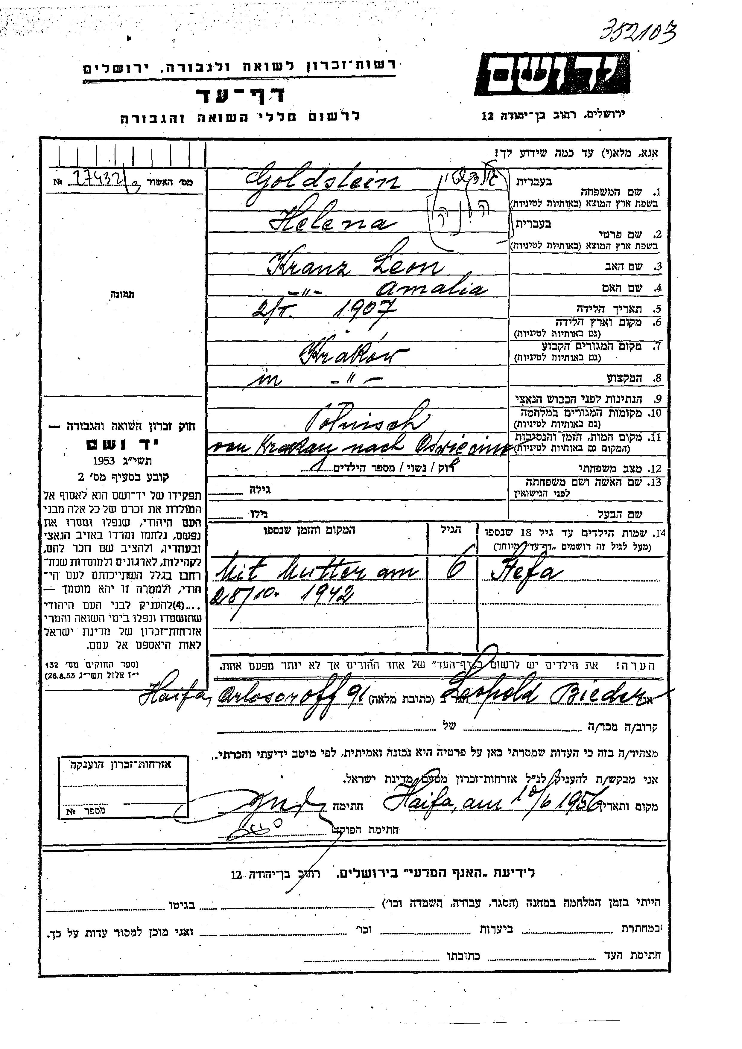 Гольдштейн Стефа Краков, Польша Лист свидетельских показаний