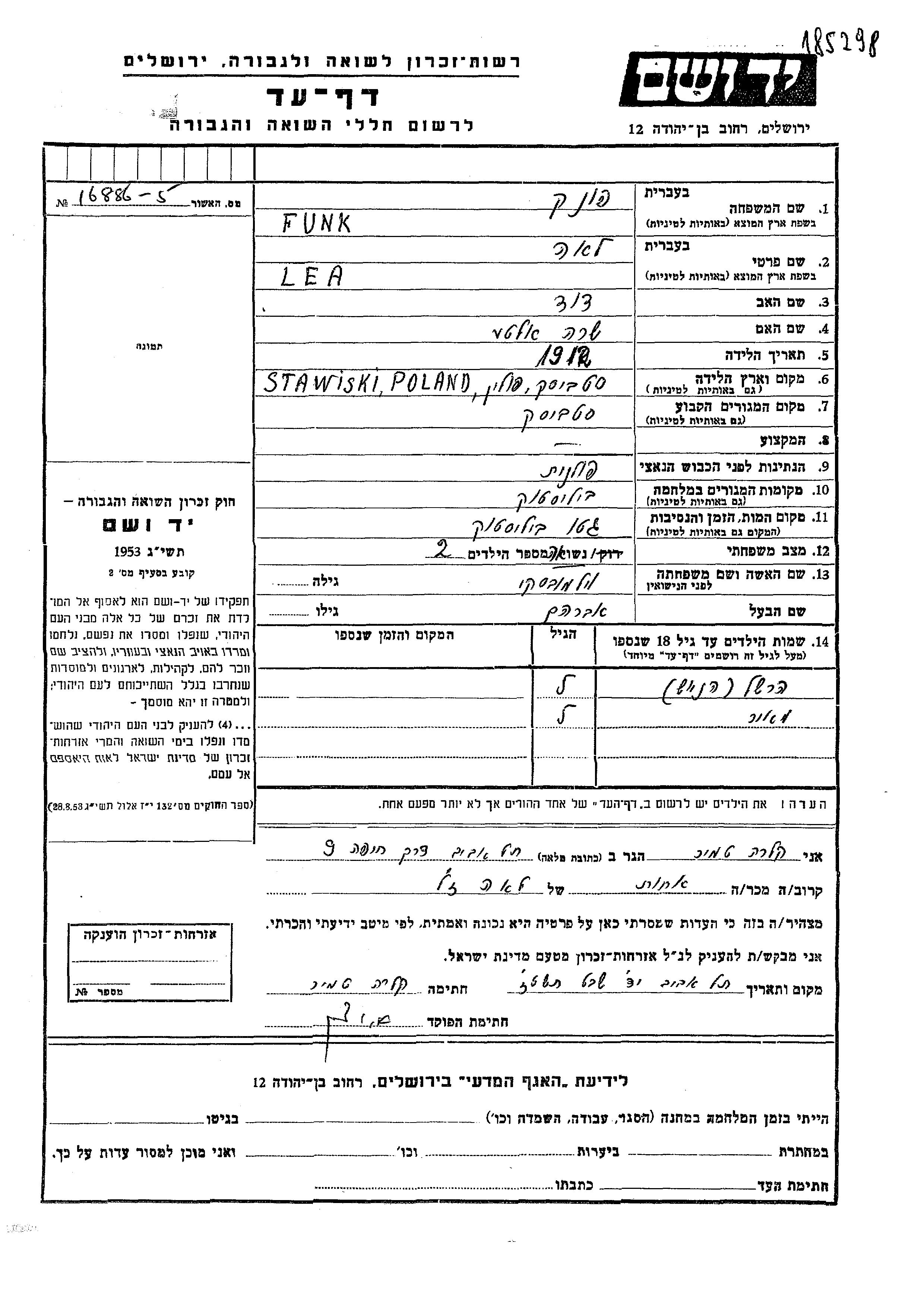 Функ Гершель Стависки, Польша Лист свидетельских показаний